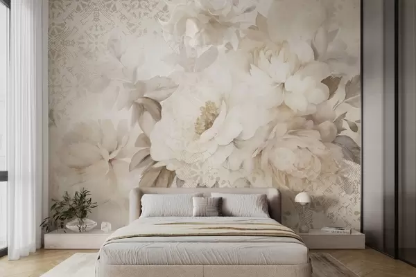 Fotomurales Un arreglo floral de peonías blancas con hojas beige, sobre un fondo decorativo con textura vintage Nr. w09345