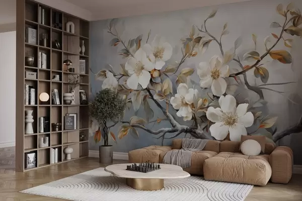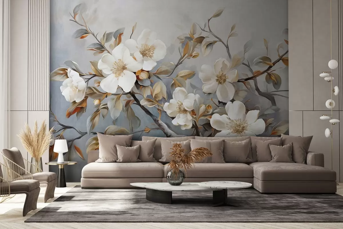 Fotomurales Flores blancas con pistilos amarillos en una rama de árbol con hojas, fondo claro, estilo de pintura vintage, impresión texturizada Nr. w09368