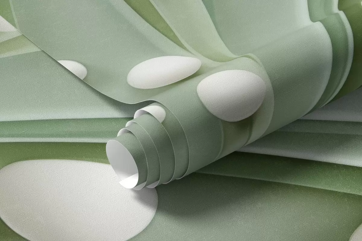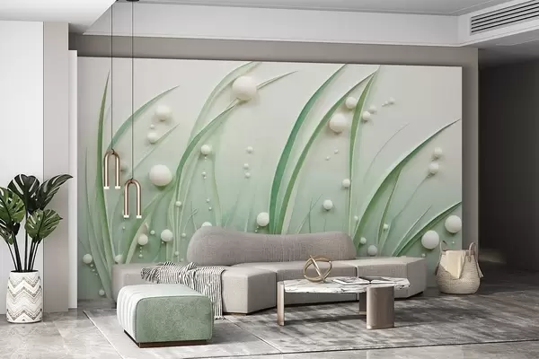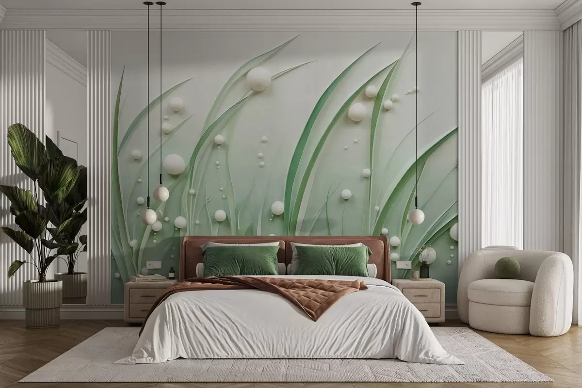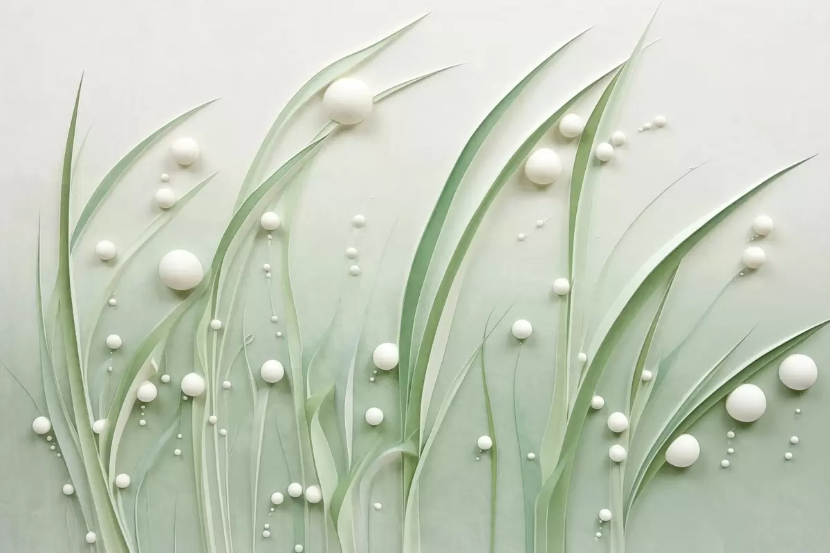 Fotomurales Hierba verde abstracta con esferas blancas, fondo verde claro, texturizado, líneas limpias, estilo minimalista Nr. w09382