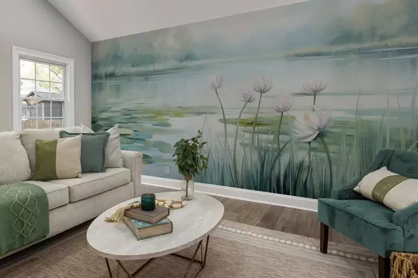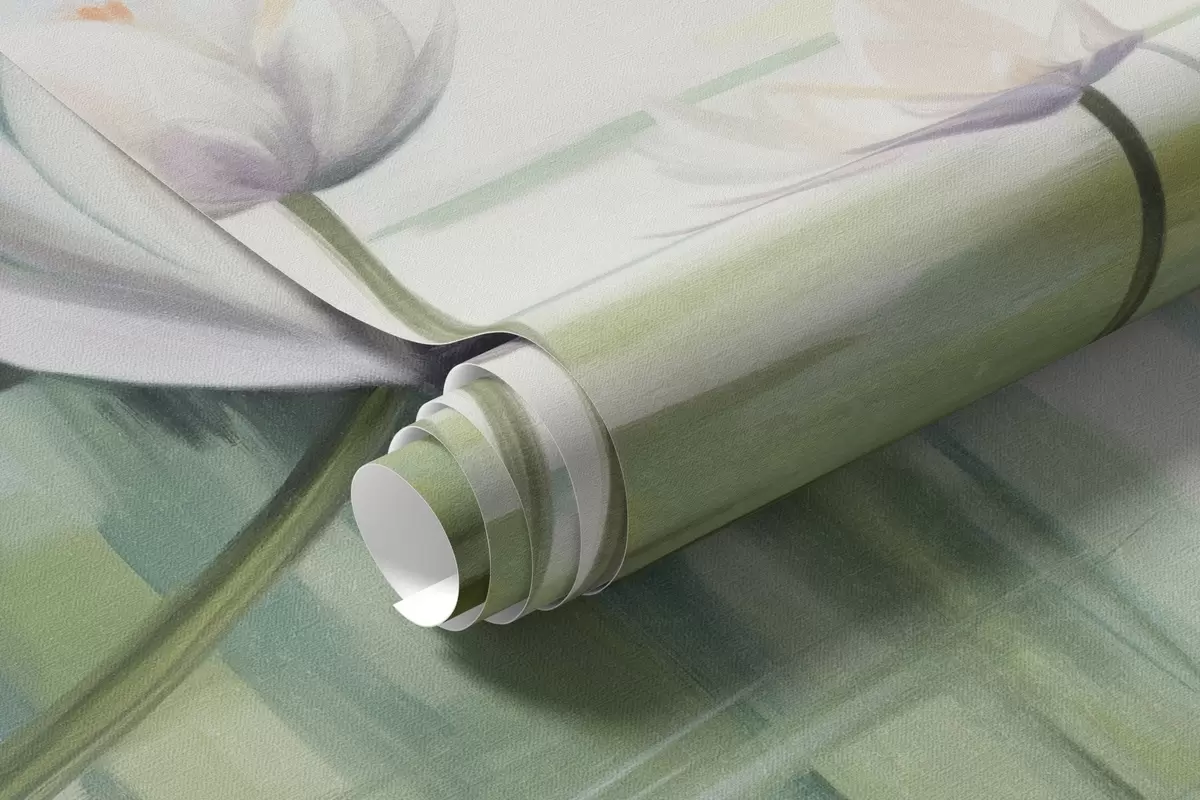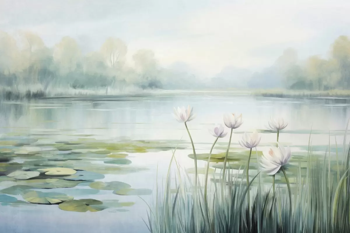 Fotomurales Paisaje con un lago, nenúfares y hojas de nenúfar, árboles al fondo, en un entorno tranquilo, tonos azul claro y verde Nr. w09395