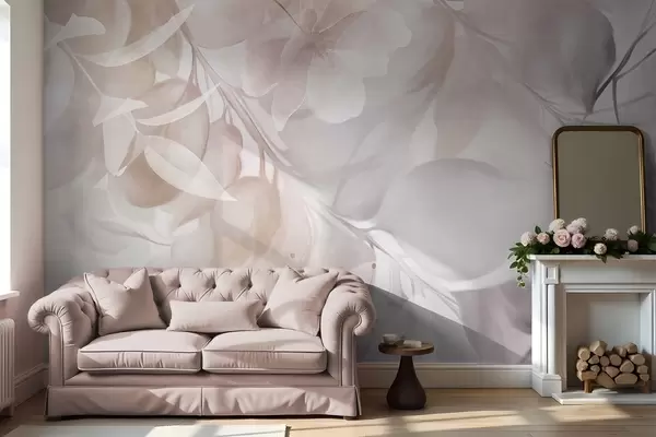 Fotomurales Arte floral con flores, hojas y ramas en tonos beige y marrón apagados, colores pastel suaves y efecto texturizado acuarela Nr. w09397