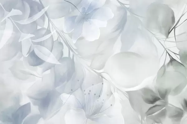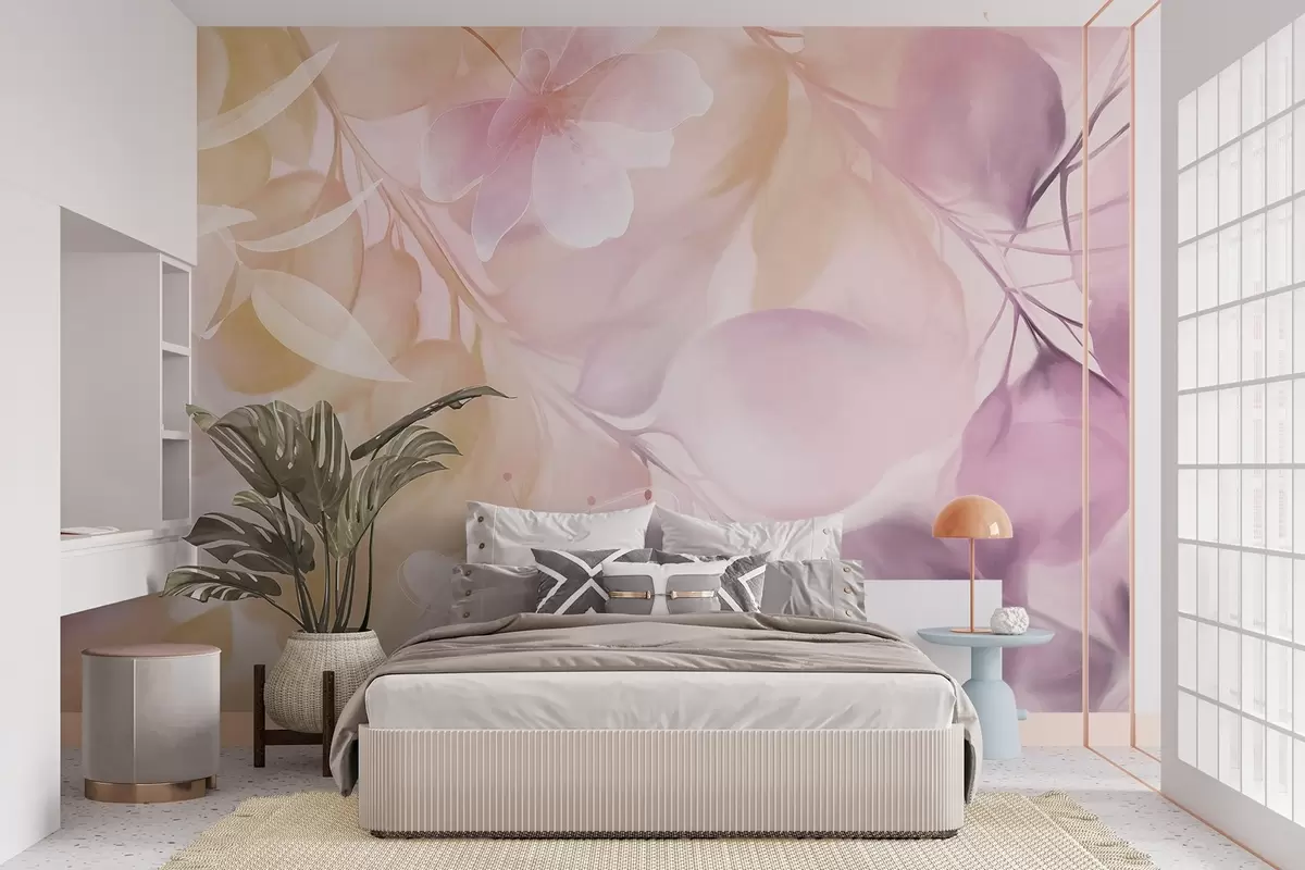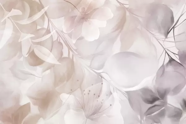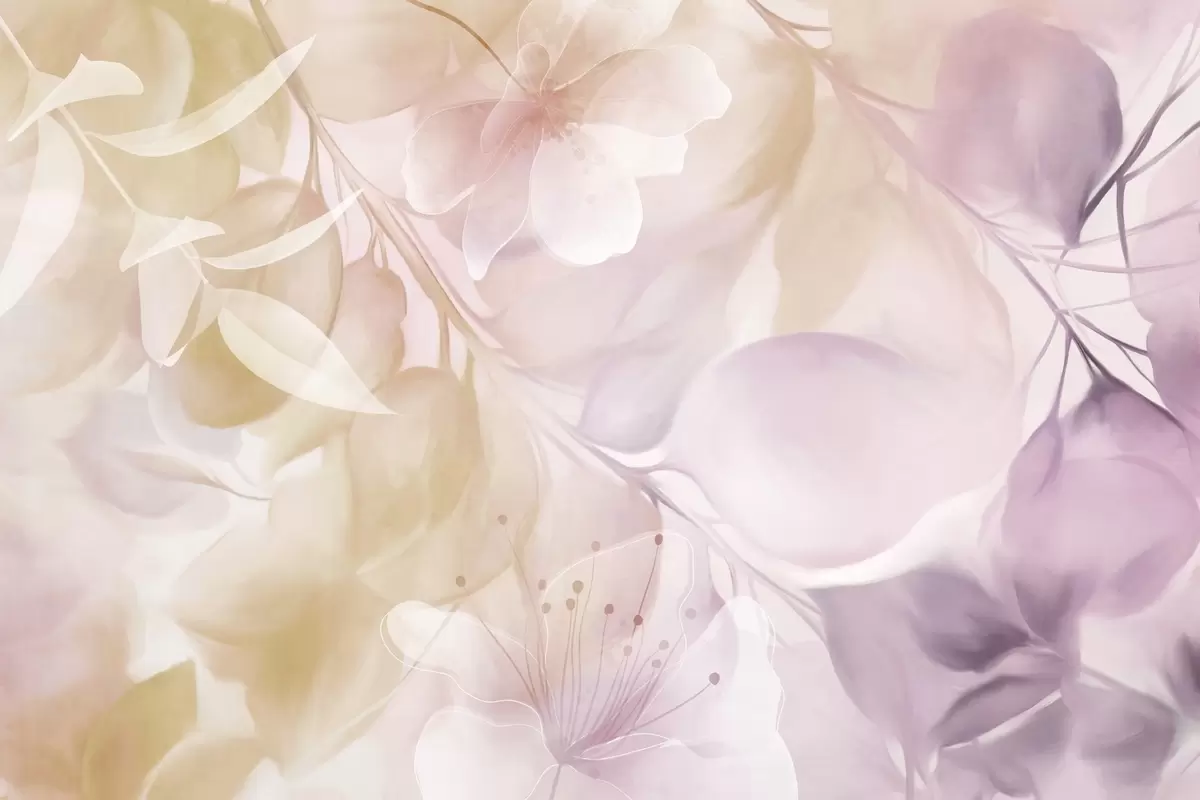 Fotomurales Arte floral con flores, hojas y ramas en tonos amarillos y morados apagados, colores pastel suaves y efecto texturizado de acuarela Nr. w09397v2