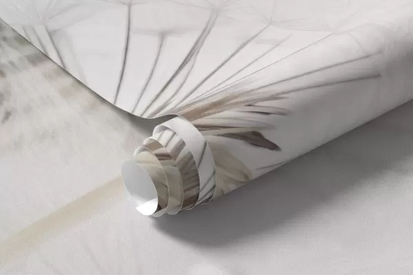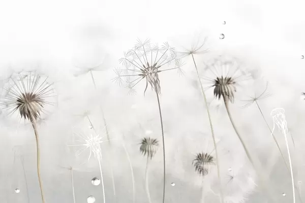 Fotomurales Dientes de león con gotas de agua, fondo blanco, primer plano, luz suave, naturaleza, botánico, etéreo, delicado, minimalista Nr. w09399