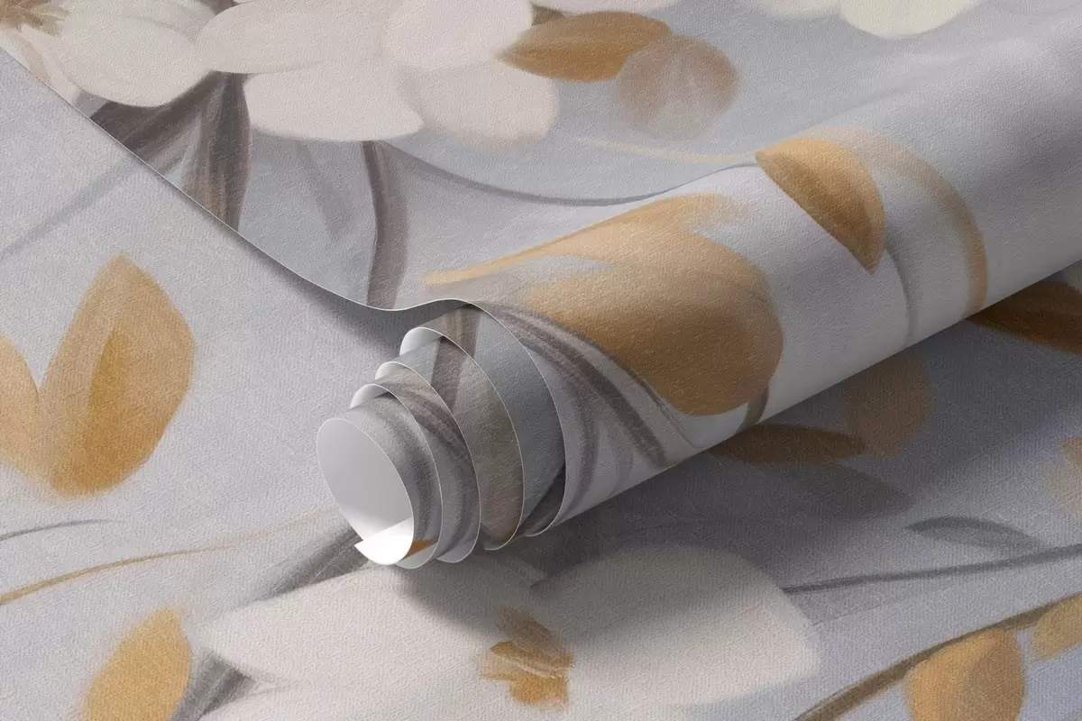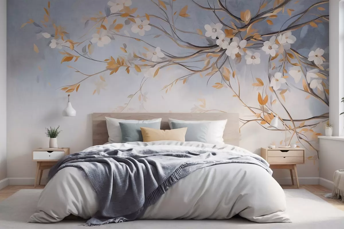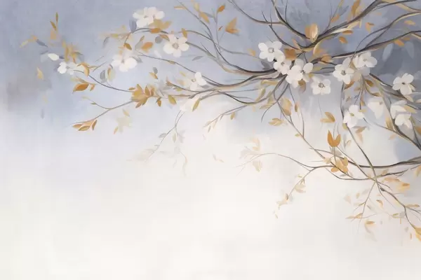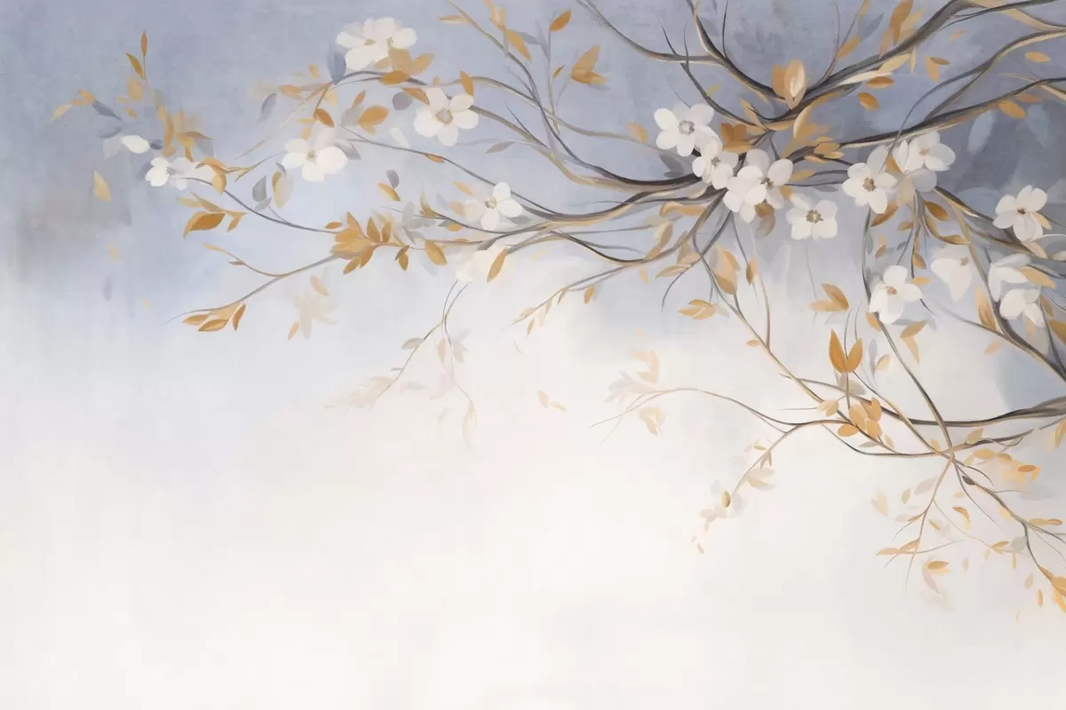 Fotomurales Flores blancas con hojas naranjas en una rama de árbol, fondo azul claro con textura, delicadas pinceladas Nr. w09415