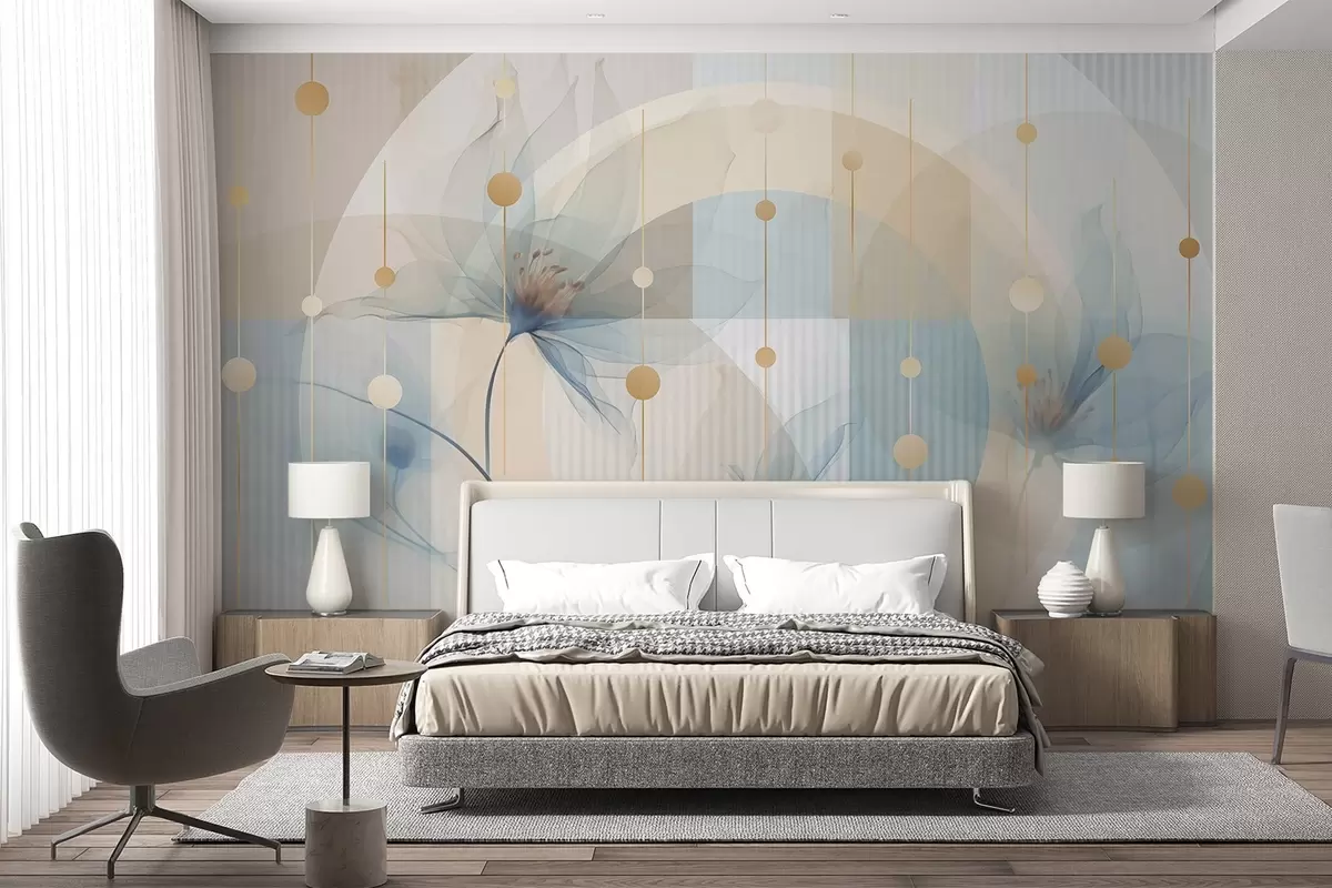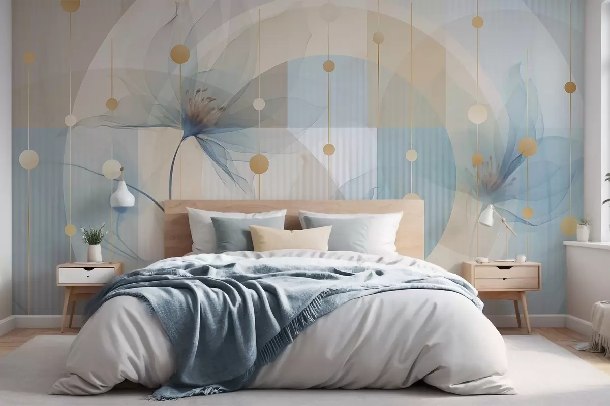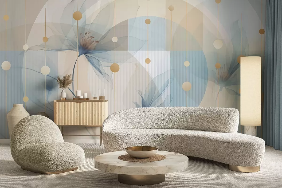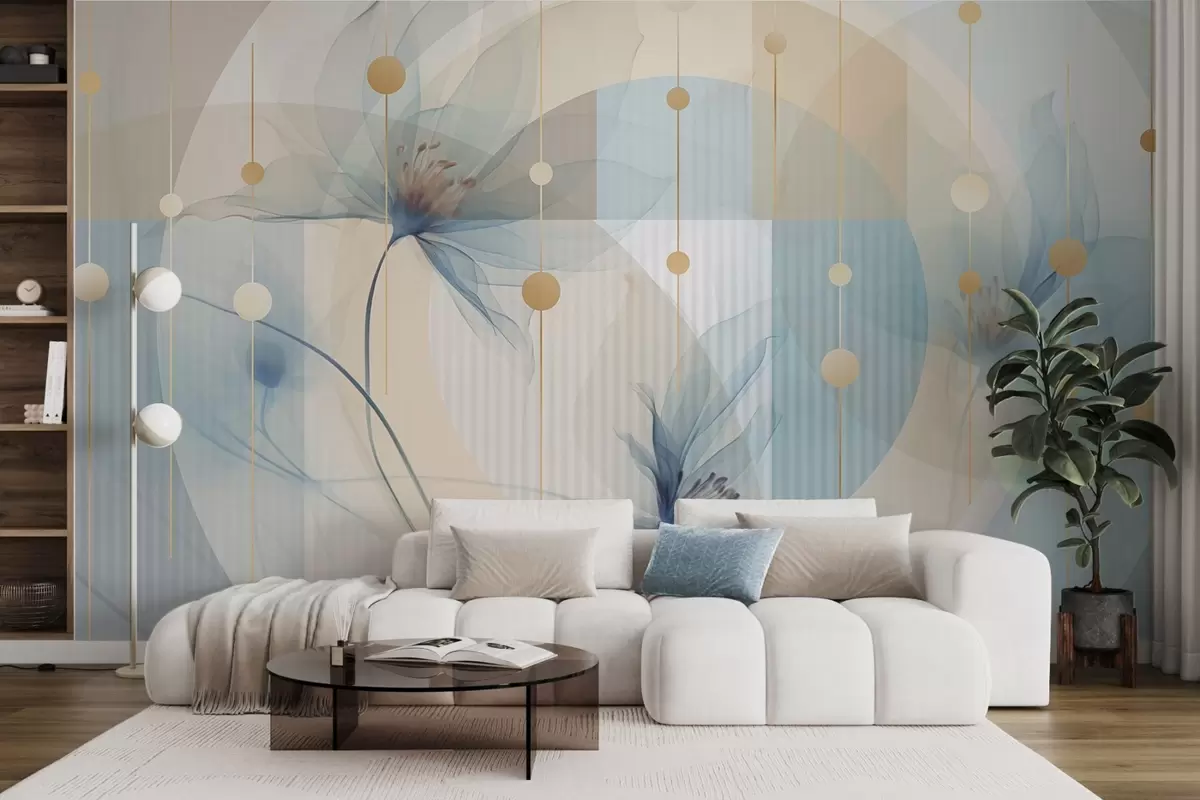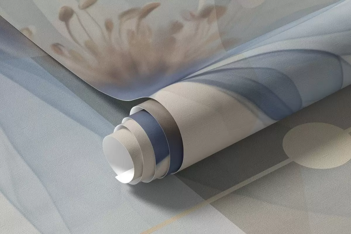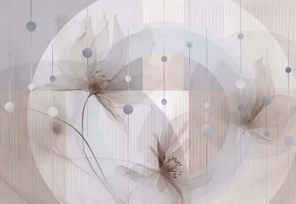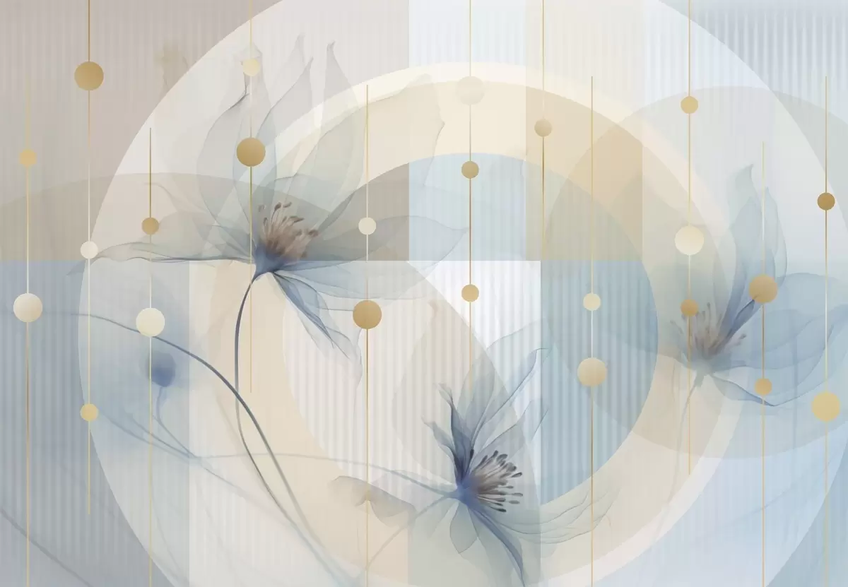 Fotomurales Flores abstractas translúcidas, círculos y formas geométricas, paleta de colores azul pastel, beige y blanco Nr. w09419