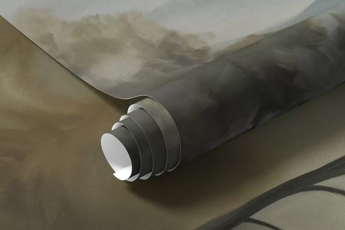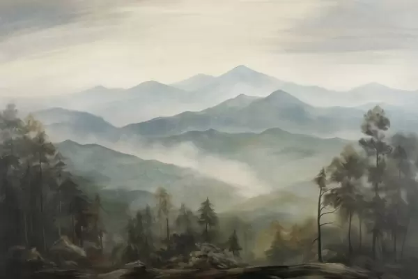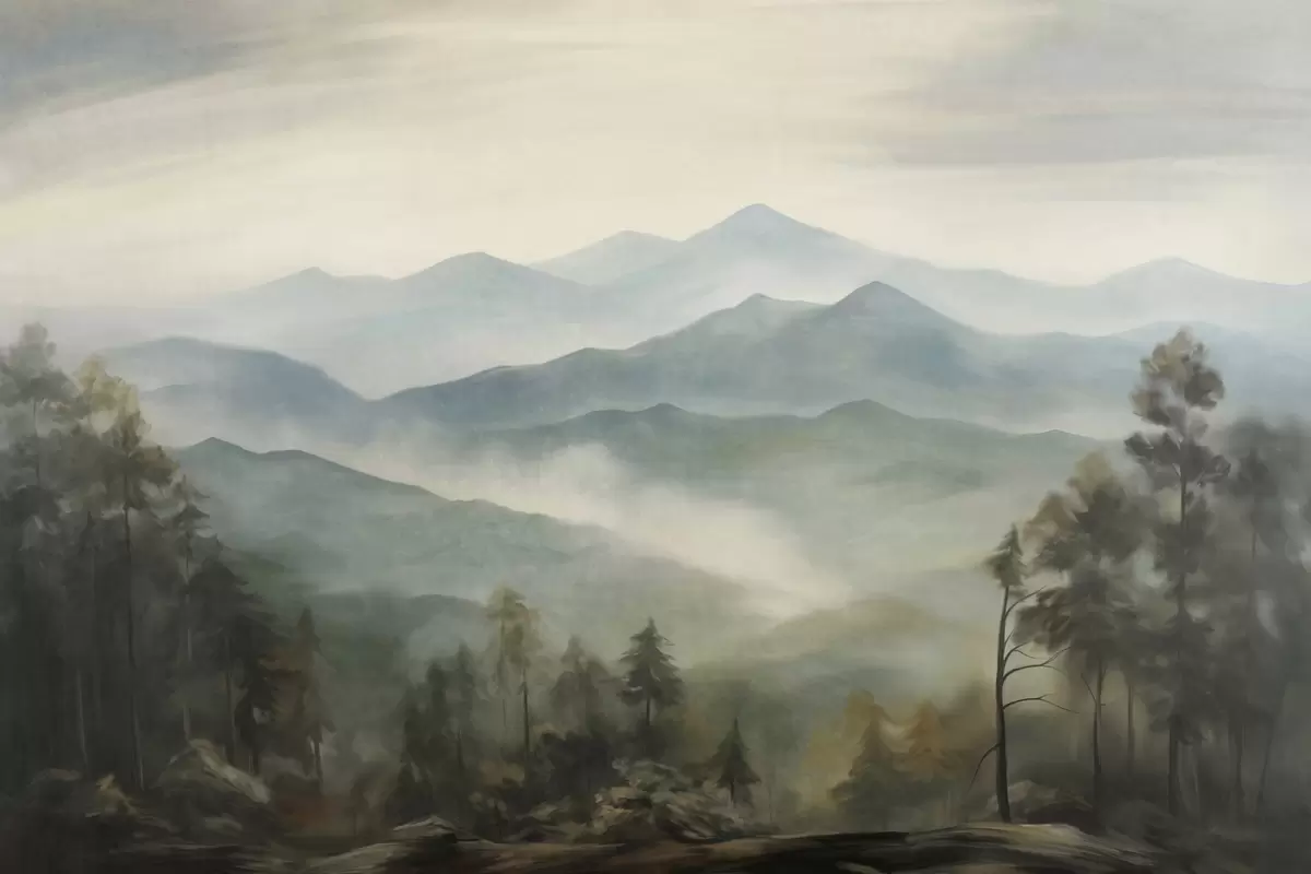 Fotomurales Cordillera brumosa con árboles, niebla, cielo nublado, colores apagados, estilo de pintura paisajística Nr. w09424