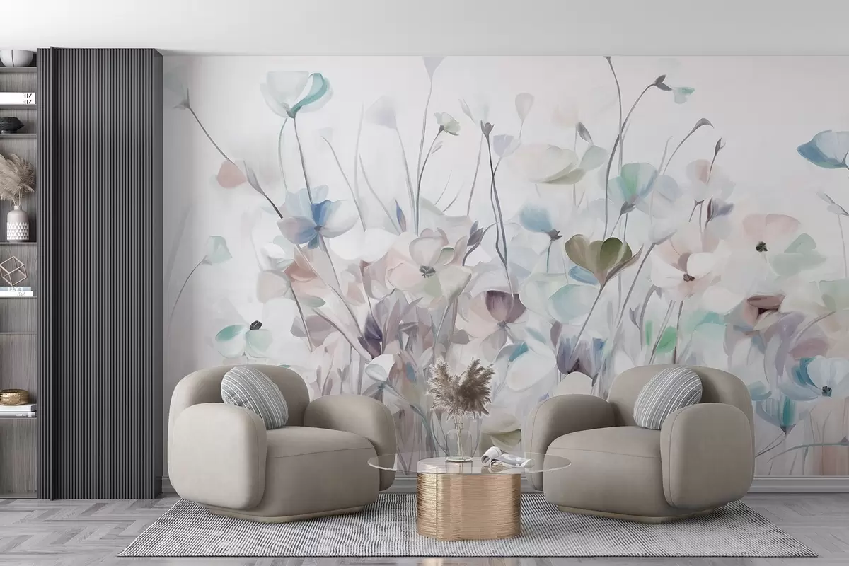 Fotomurales Campo abstracto de flores azules y marrones con tallos largos y hojas, texturizado, colores pastel y apagados Nr. w09466v1
