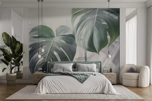 Fotomurales Hojas de monstera texturizadas, grandes y verdes, sobre un fondo abstracto suave y claro. Nr. w09477