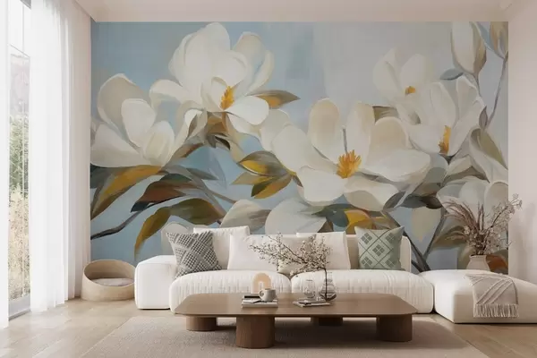 Fotomurales Magnolias blancas con hojas verdes sobre fondo azul claro con imitación de pinceladas abstractas. Nr. w09478