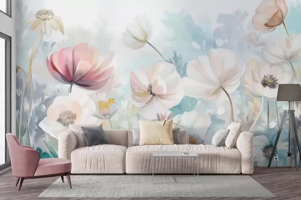 Fotomurales Un campo de flores en tonos pastel con delicados pétalos y suaves hojas verdes, en un estilo acuarela onírico y texturizado Nr. w09481