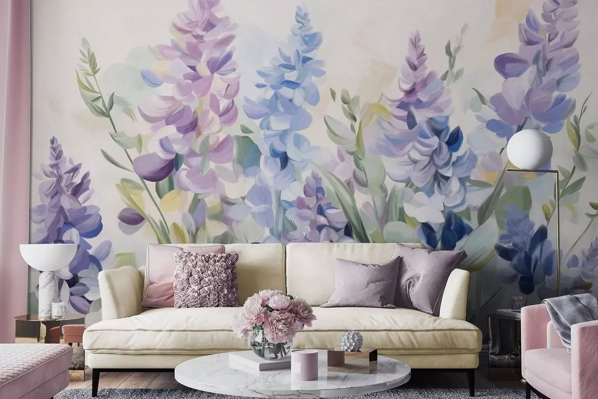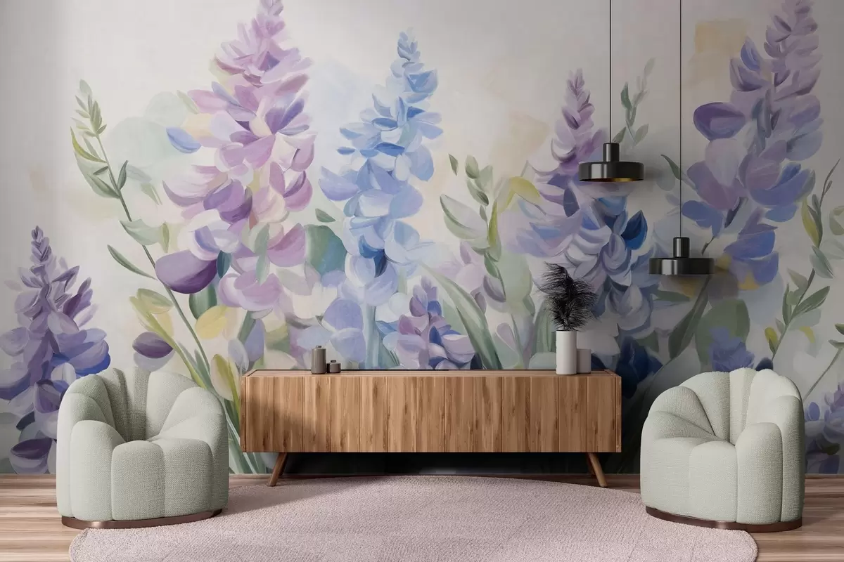 murales de pared Flores moradas y azules con textura y hojas azules, fondo claro, pinceladas suaves, colores vibrantes w09482