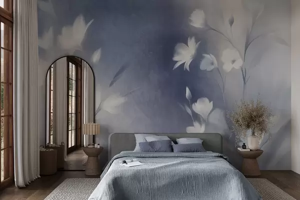 murales de pared Flores blancas con textura y tallos largos, capullos suaves sobre un fondo difuminado de tonos azules y blancos w09484