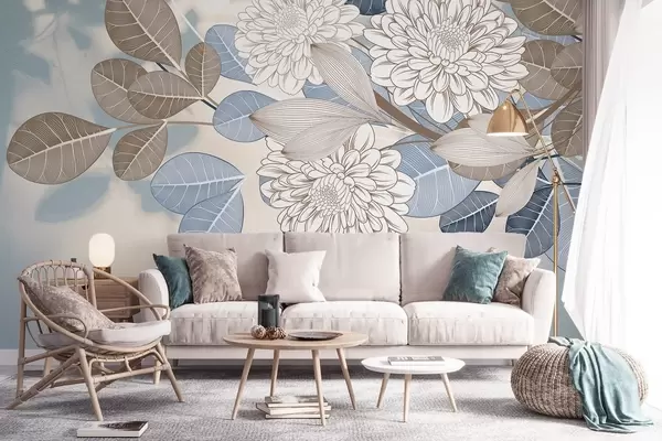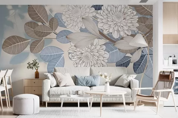 Fotomurales Flores blancas con hojas azules y marrones, fondo azul claro con textura, arreglo floral, dibujo lineal detallado Nr. w09496