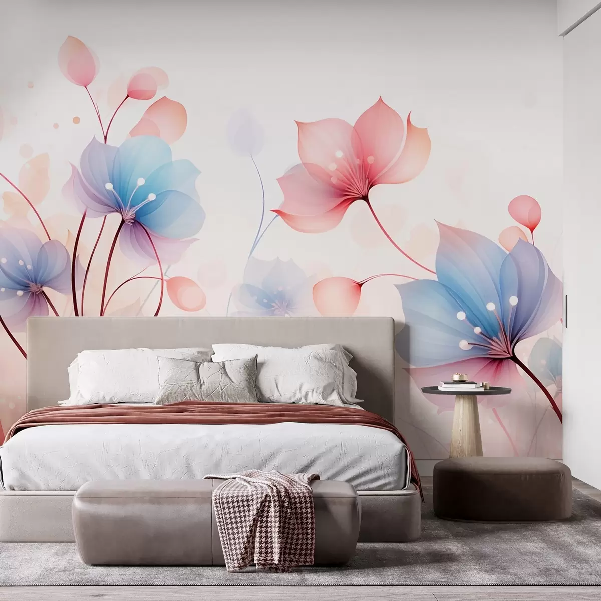 Fotomurales Delicadas flores rosa y azul: flora etérea sobre un fondo blanco acuarelado. Nr. w09507