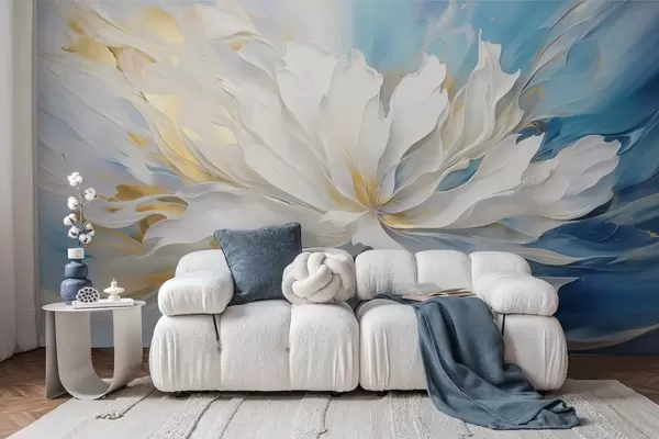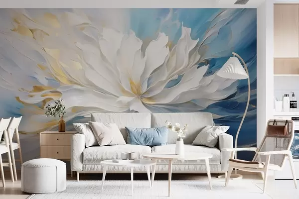 Fotomurales Gran peonía blanca en estilo pintura al óleo sobre fondo azul y amarillo Nr. w09511