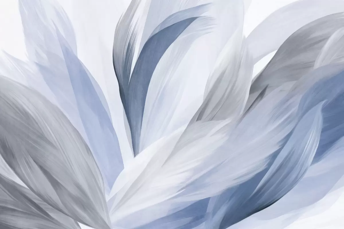 Fotomurales Plumas abstractas con textura en azul, blanco y gris y varios tonos, superpuestas sobre un fondo blanco. Nr. w09531v1