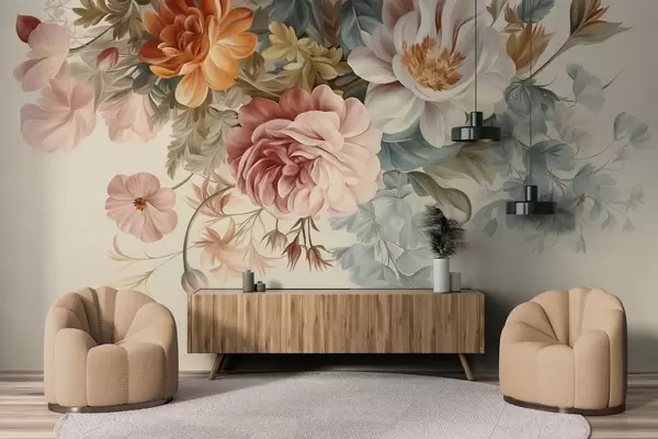 Fotomurales Arreglo floral vintage con rosas, peonías y otras flores con textura y follaje, sobre un fondo claro. Nr. w09532