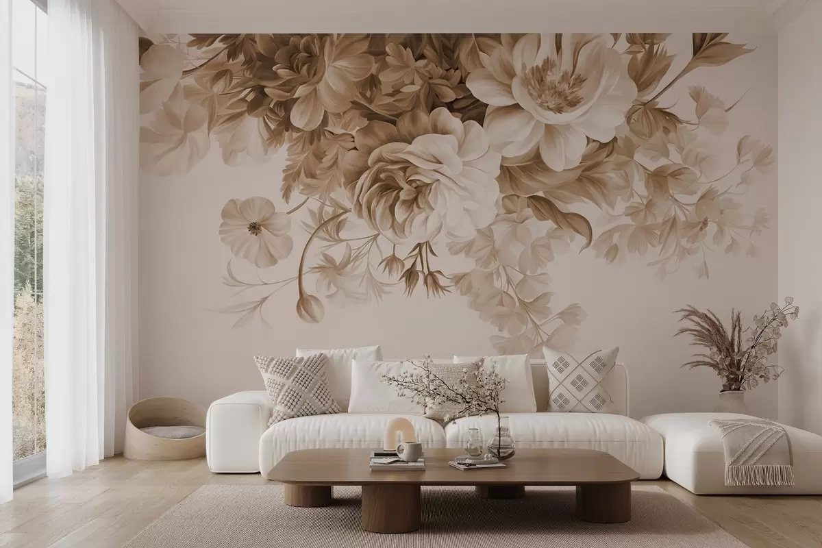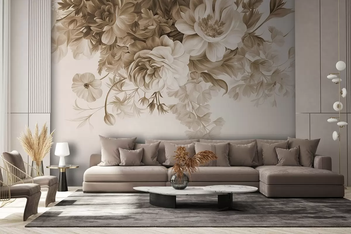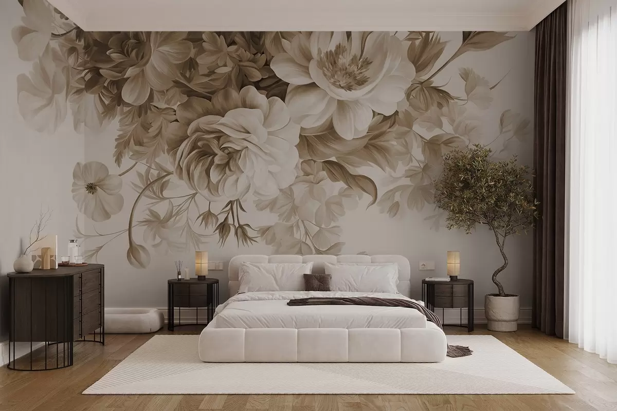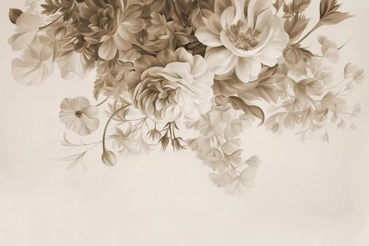 Fotomurales Arreglo floral vintage con rosas, peonías y otras flores con textura y follaje, sobre un fondo claro. Nr. w09532v1