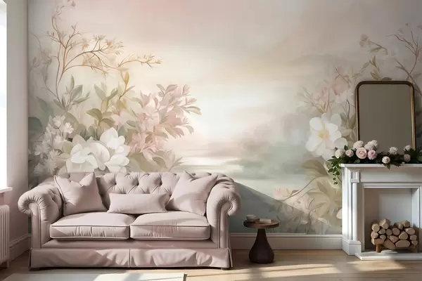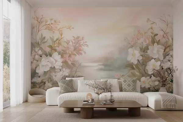 Fotomurales Un paisaje con un río rodeado de flores y plantas, colores suaves, cielo rosado, estilo con textura de acuarela. Nr. w09537