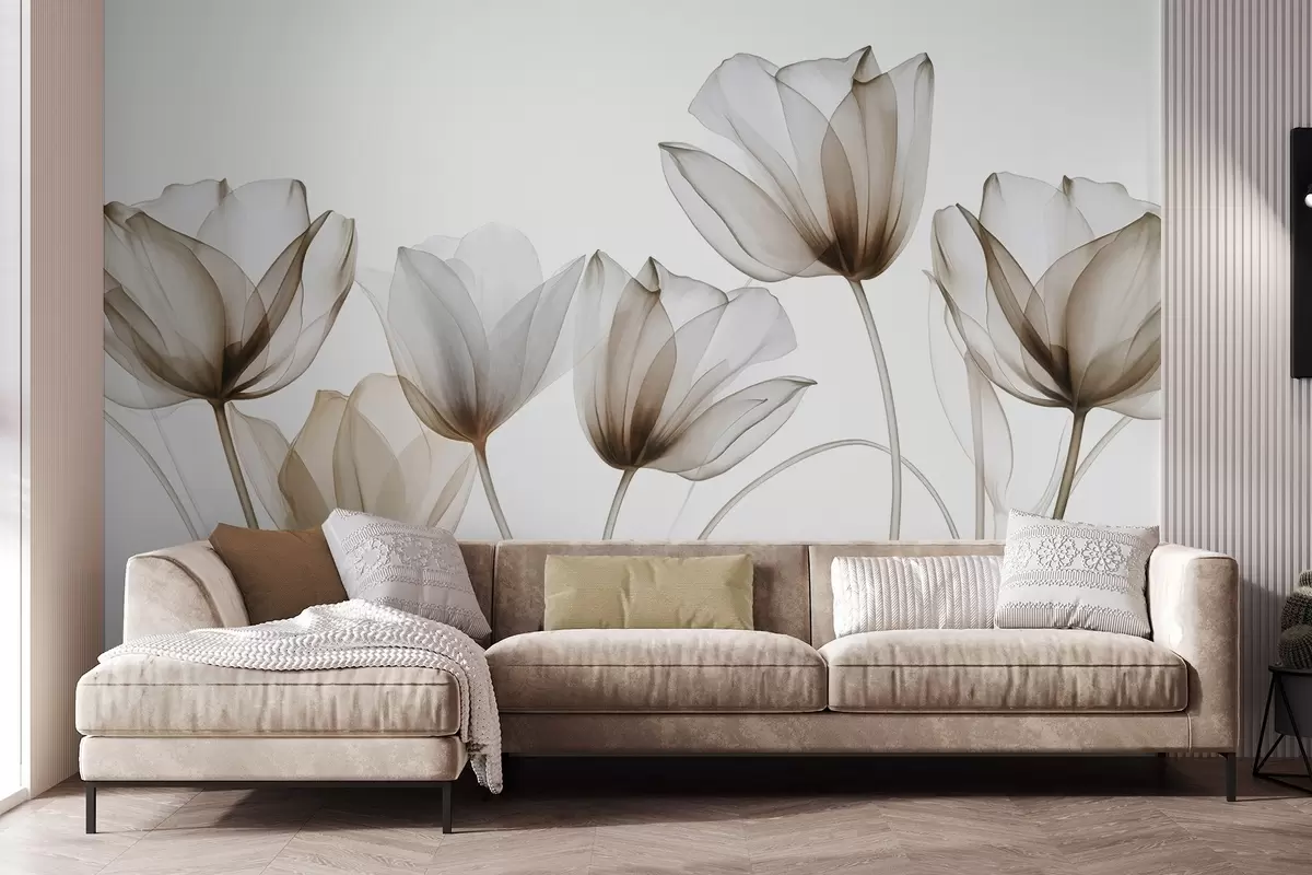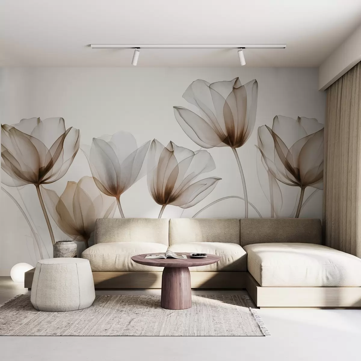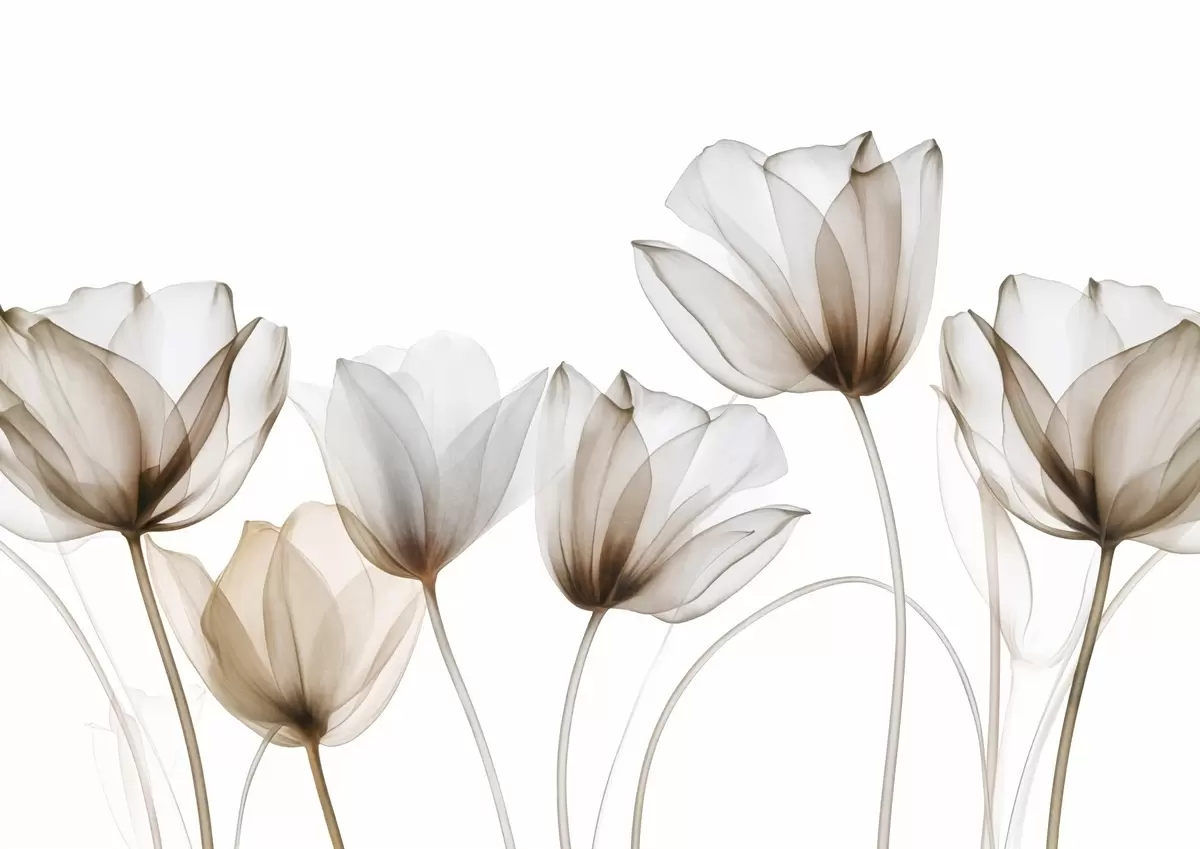 Fotomurales Flores de tulipán translúcidas de color marrón y blanco con tallos largos, sobre un fondo claro, delicadas y con textura, arte floral. Nr. w09538v1