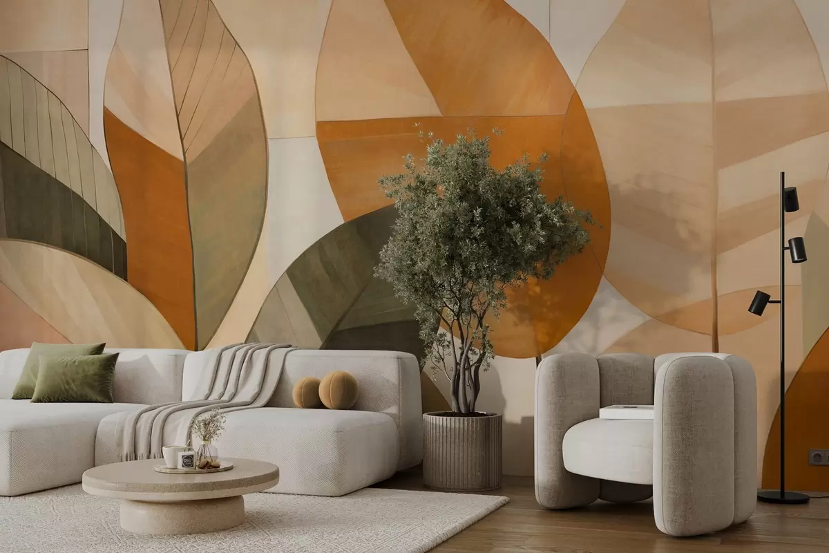 Fotomurales Hojas abstractas grandes en tonos naranjas, marrones y verdes, con textura, dispuestas sobre un fondo claro Nr. w09539