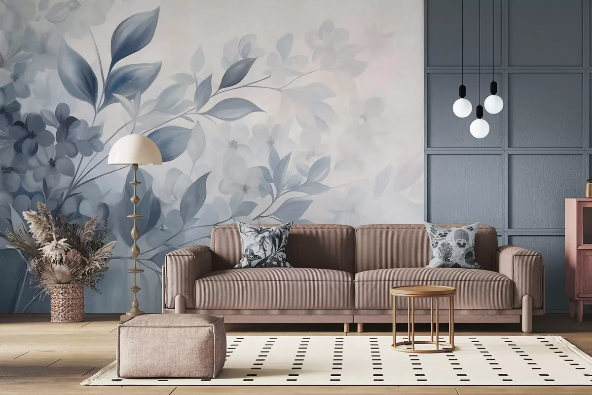 Fotomurales Rama azul y blanca con textura, con flores y hojas que se desvanecen en un fondo claro, estilo pintura acuarela. Nr. w09543