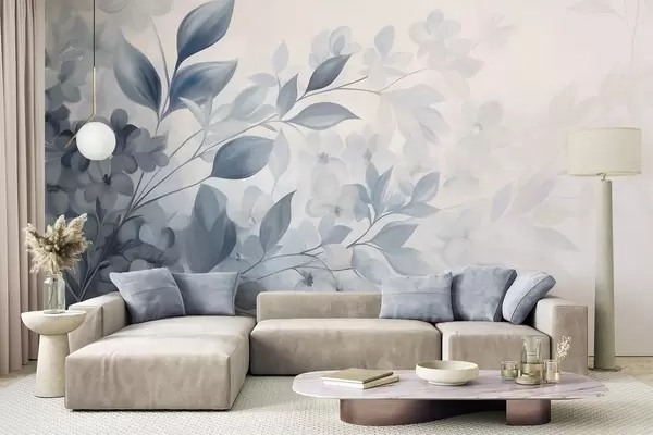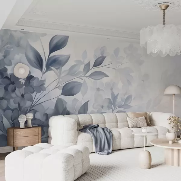 Fotomurales Rama azul y blanca con textura, con flores y hojas que se desvanecen en un fondo claro, estilo pintura acuarela. Nr. w09543