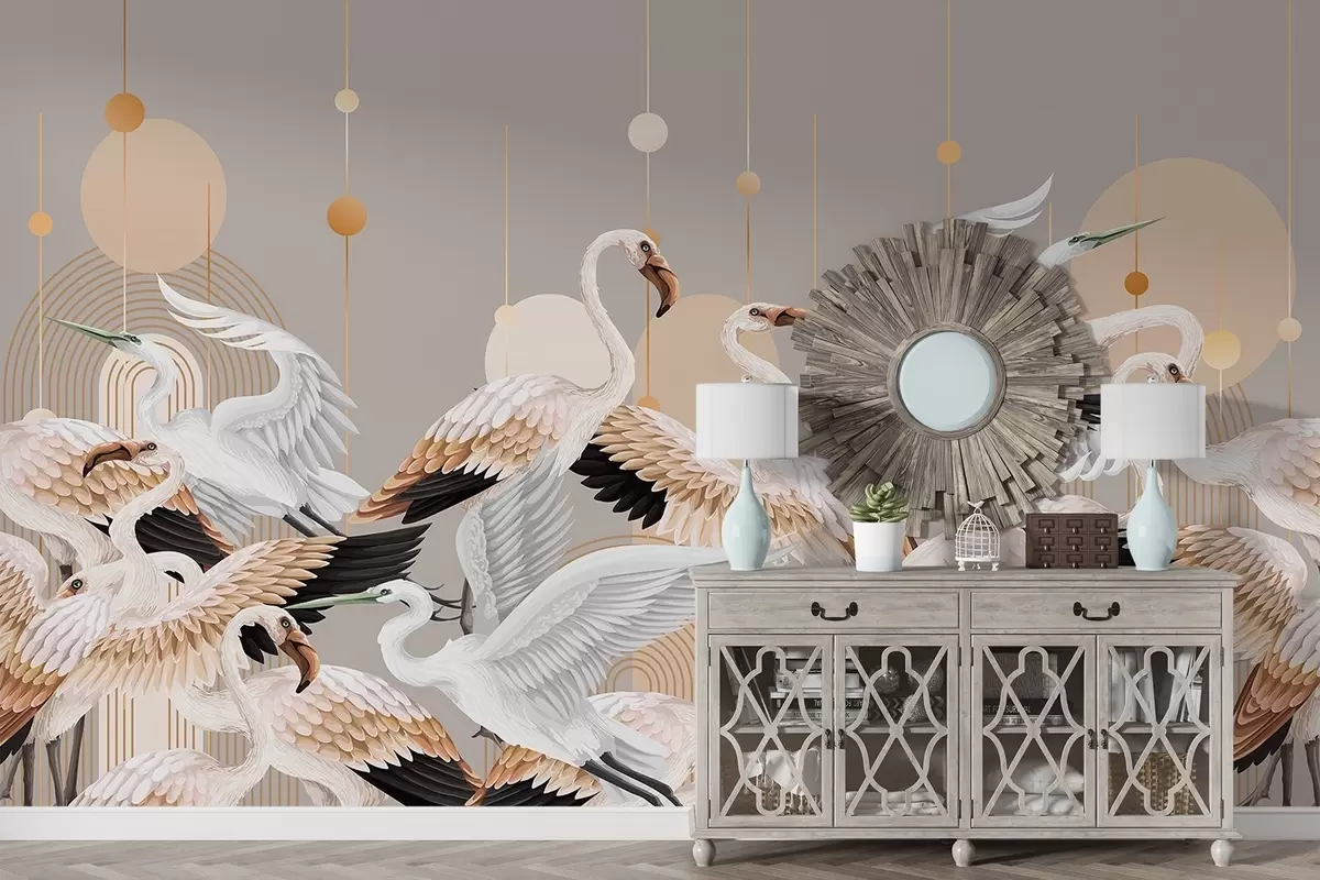 Fotomurales Una bandada de flamencos blancos con delicadas alas, sobre un fondo neutro con líneas y círculos amarillos. Nr. w09546v1