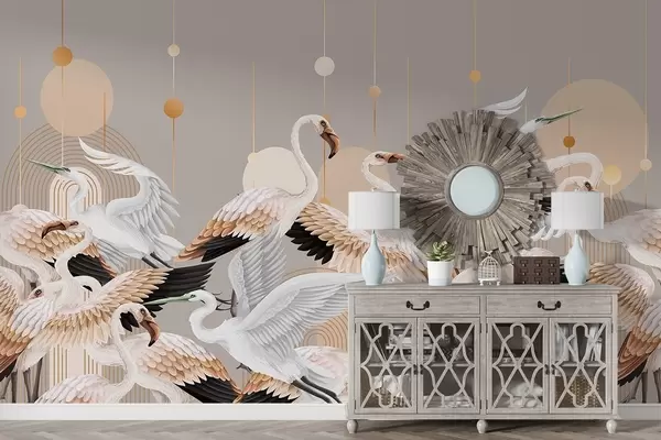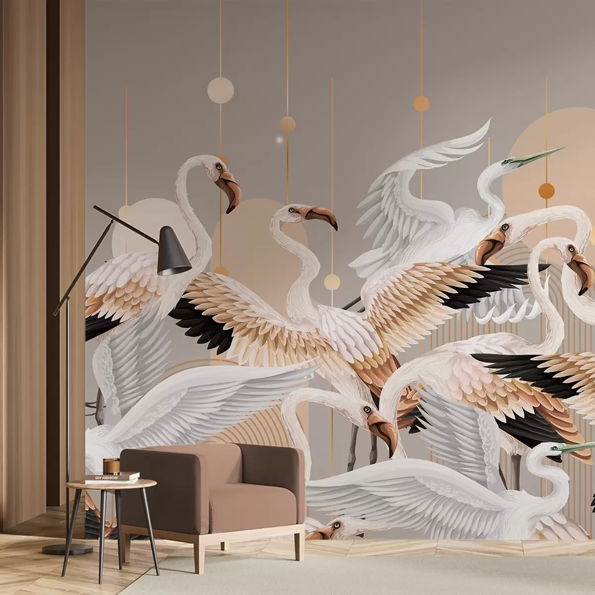 Fotomurales Una bandada de flamencos blancos con delicadas alas, sobre un fondo neutro con líneas y círculos amarillos Nr. w09546v1