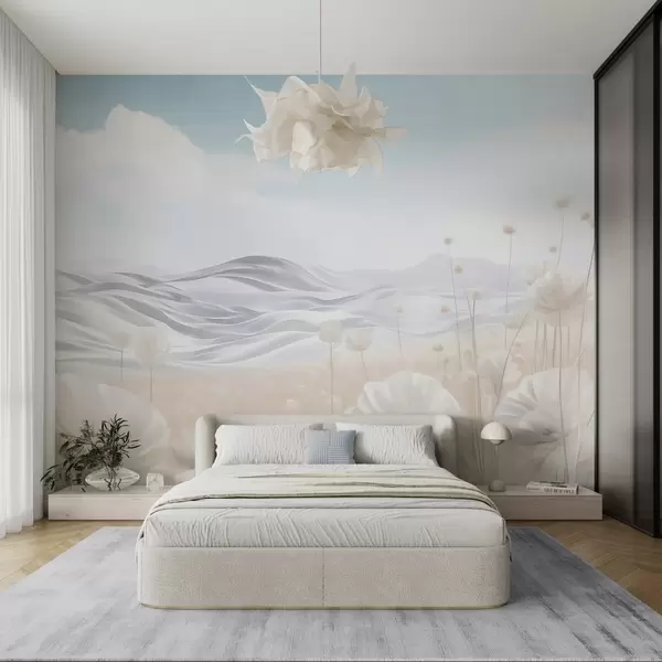 Fotomurales Campo texturizado de amapolas cremosas con colinas onduladas bajo un cielo azul pálido con nubes suaves, colores pastel. Nr. w09553