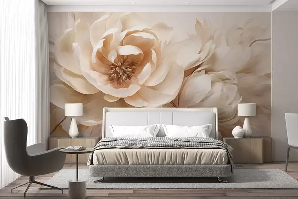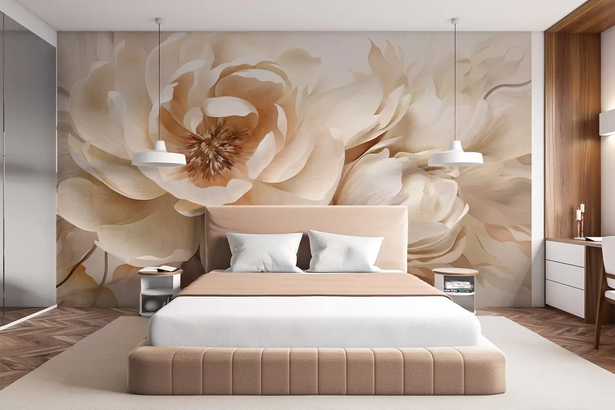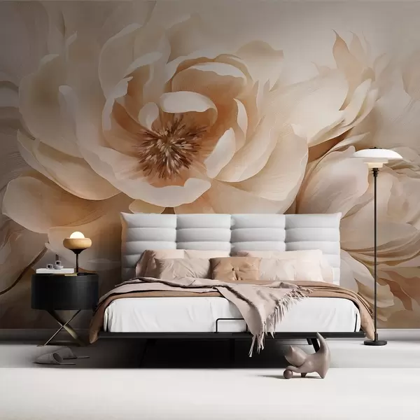 Fotomurales Peonías de textura cremosa con centros marrones y hojas sobre un fondo abstracto difuminado y claro. Nr. w09554