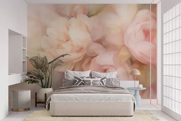 murales de pared Peonías difuminadas en rosa pálido y crema con suaves pinceladas pictóricas, creando un arreglo floral con textura. w09556