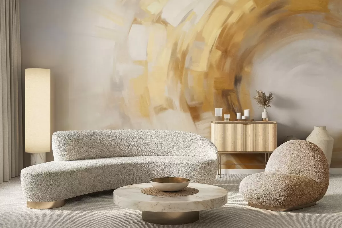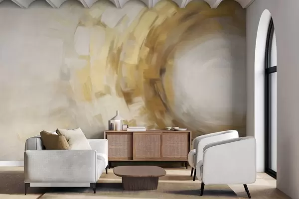 Fotomurales Imitación de pintura abstracta con pinceladas circulares texturizadas en amarillo y blanco, creando una sensación de movimiento. Nr. w09558