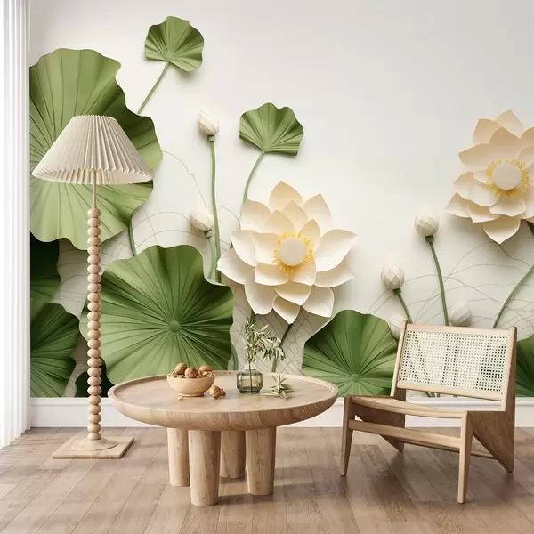 Fotomurales Flores de loto en 3D con hojas verdes texturizadas, estilo minimalista. Nr. w09560