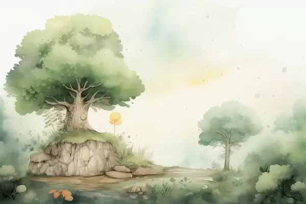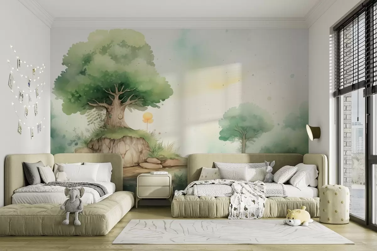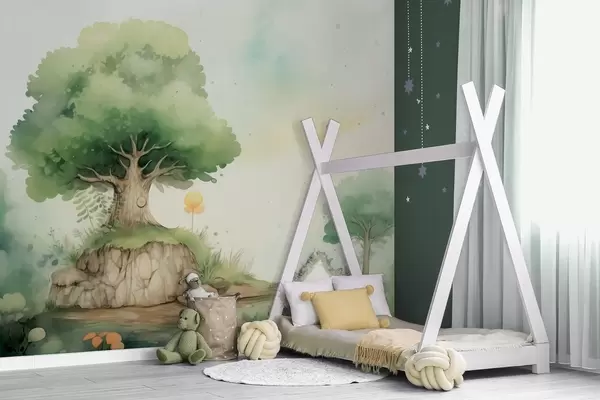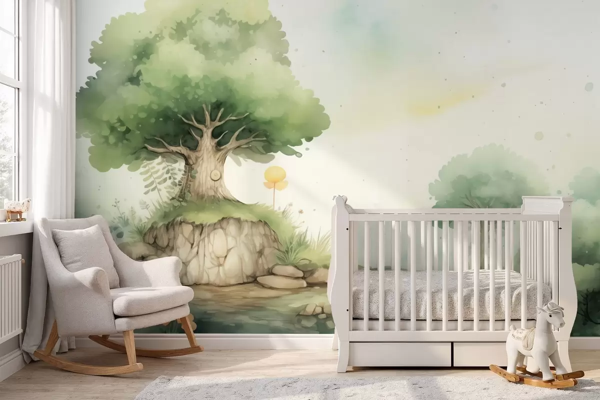 Fotomurales Un mundo de cuento de hadas de la infancia en un paisaje boscoso verde, estilo acuarela. Nr. w09566