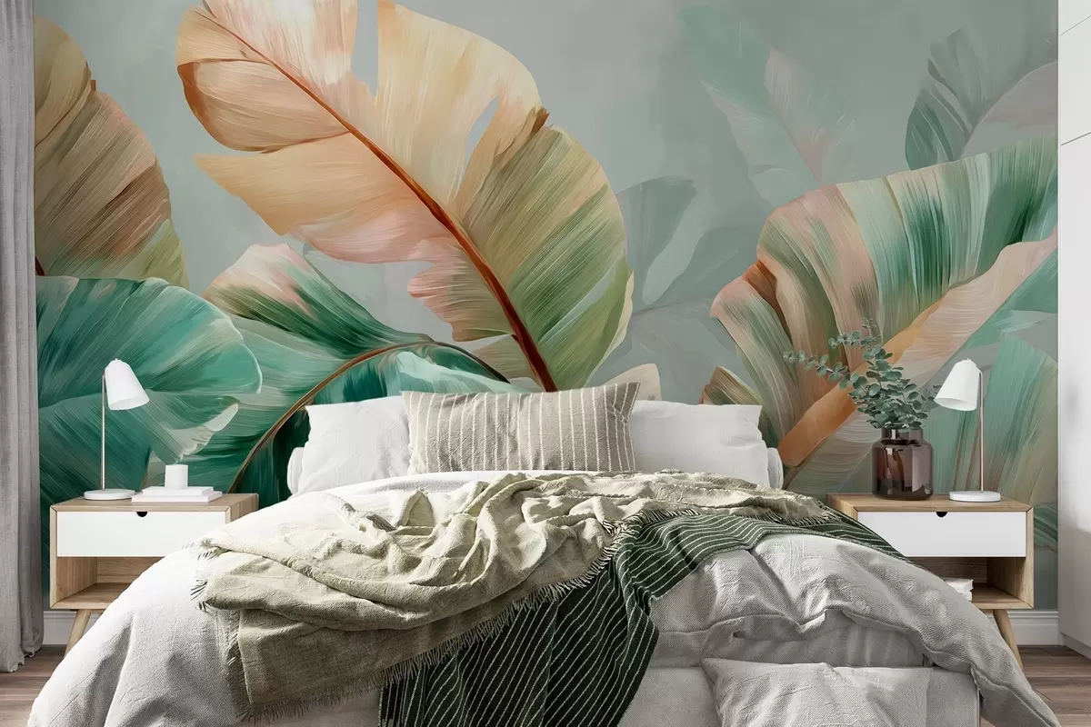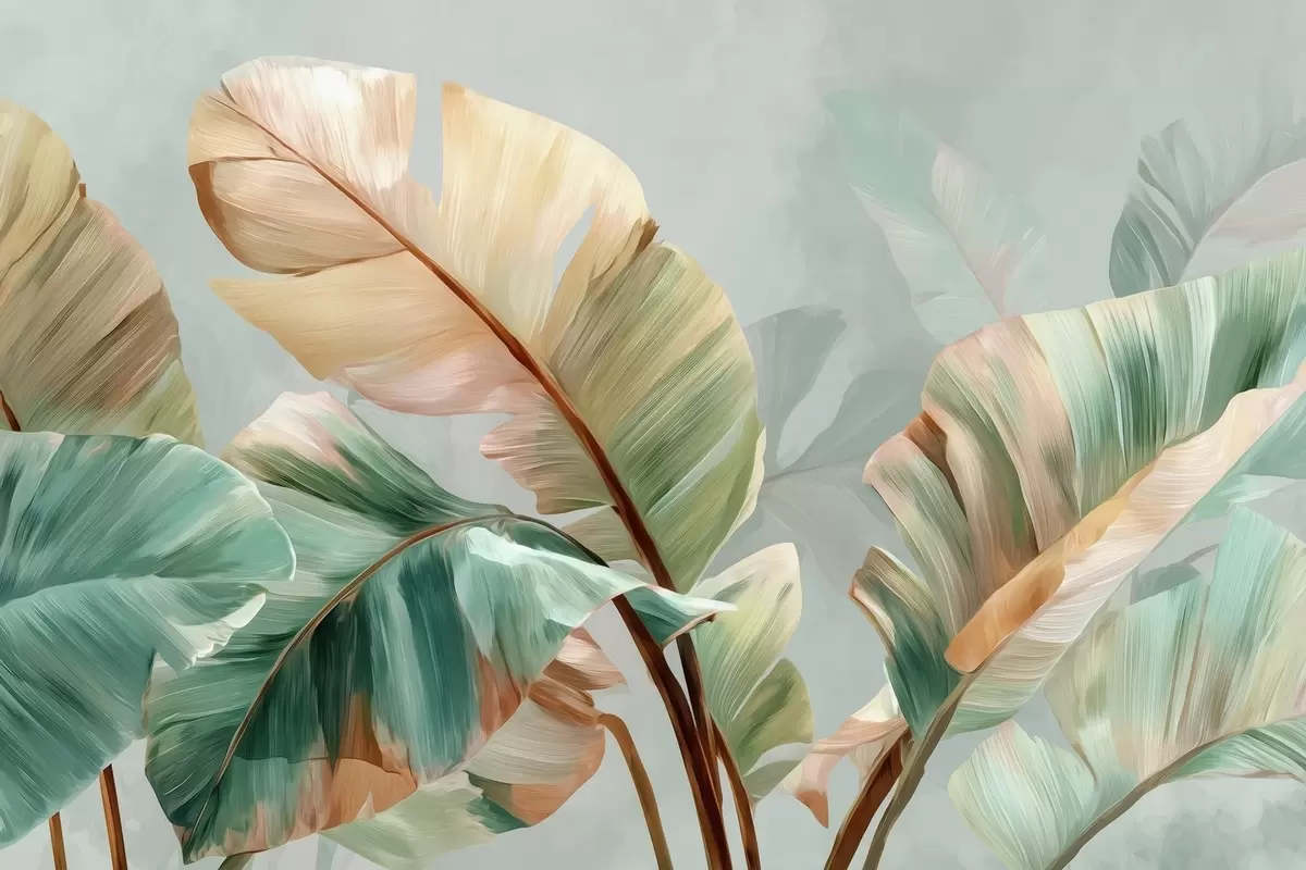Fotomurales Delicadas hojas tropicales de plátano en tonos pastel amarillo verdosos. Nr. w09581