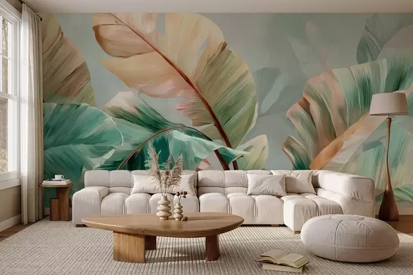 Fotomurales Delicadas hojas tropicales de plátano en tonos pastel amarillo verdosos. Nr. w09581