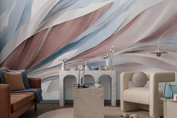 Fotomurales Ondas abstractas fluidas de color azul y marrón, con formas y líneas finas, sobre un fondo blanco, arte texturizado. Nr. w09585v1