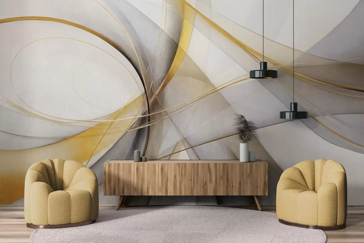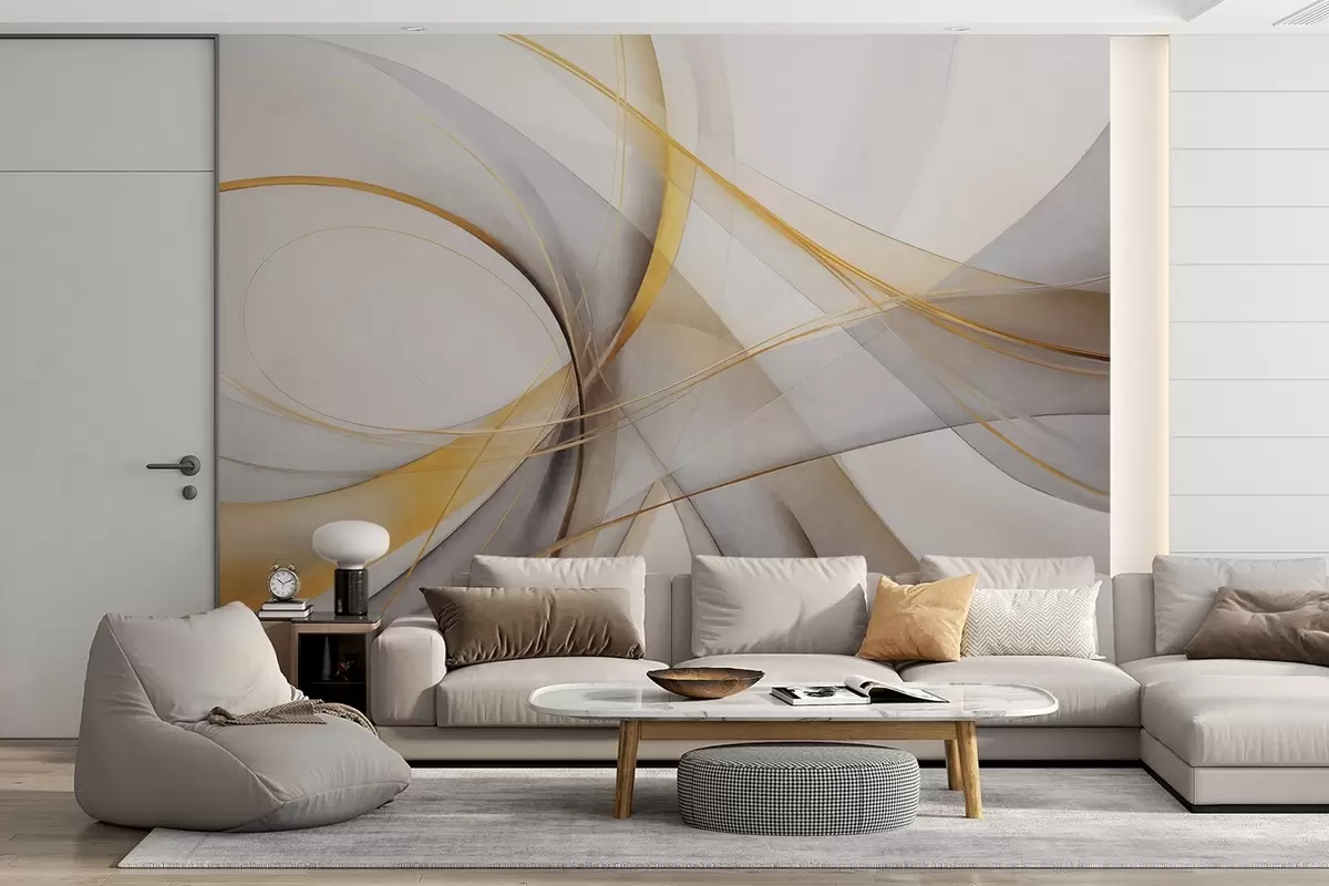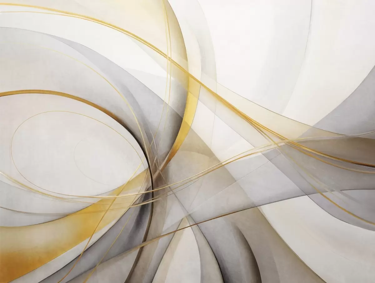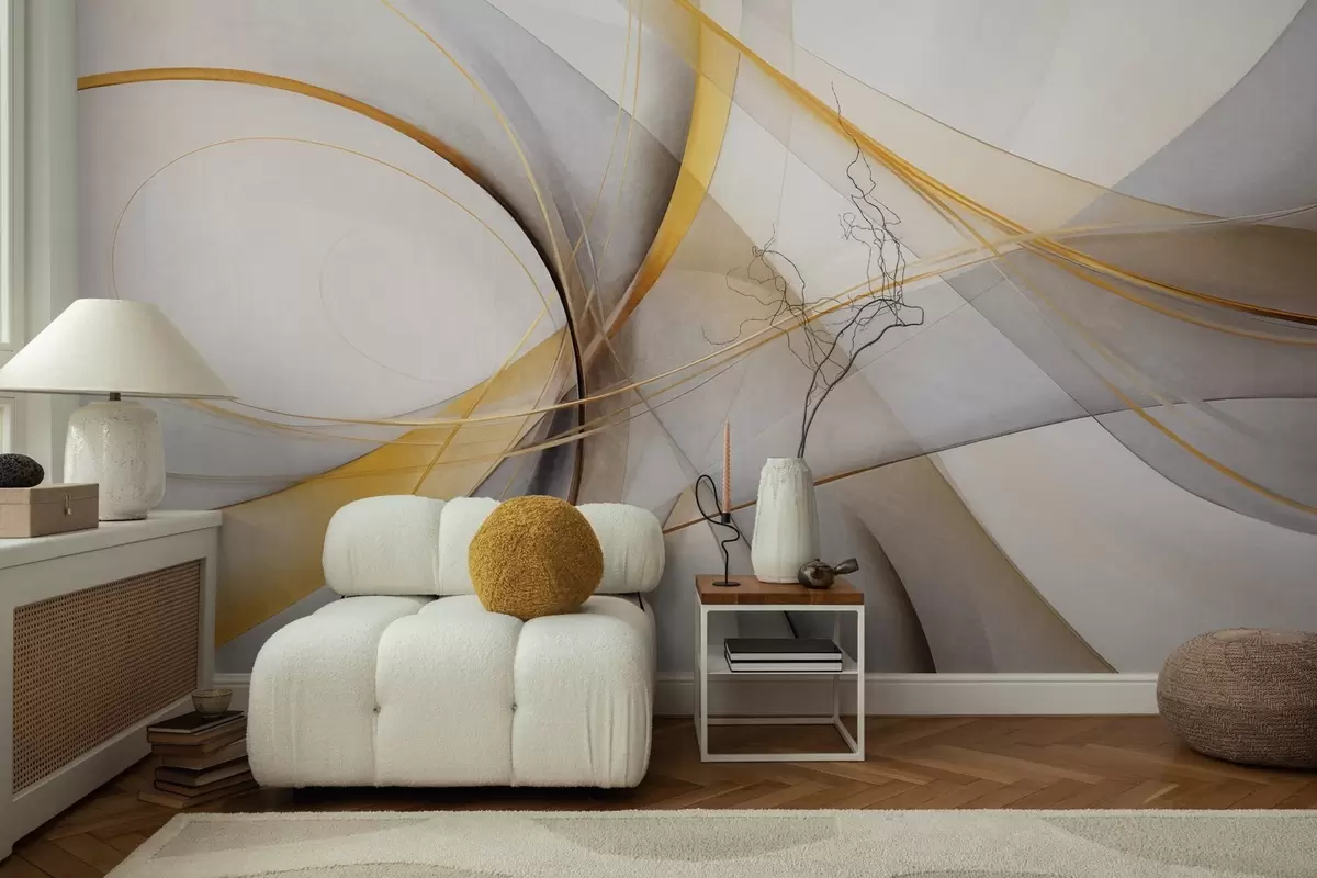 Fotomurales Líneas abstractas fluidas en amarillo y blanco sobre fondo gris, con sensación de movimiento y profundidad, arte moderno. Nr. w09587