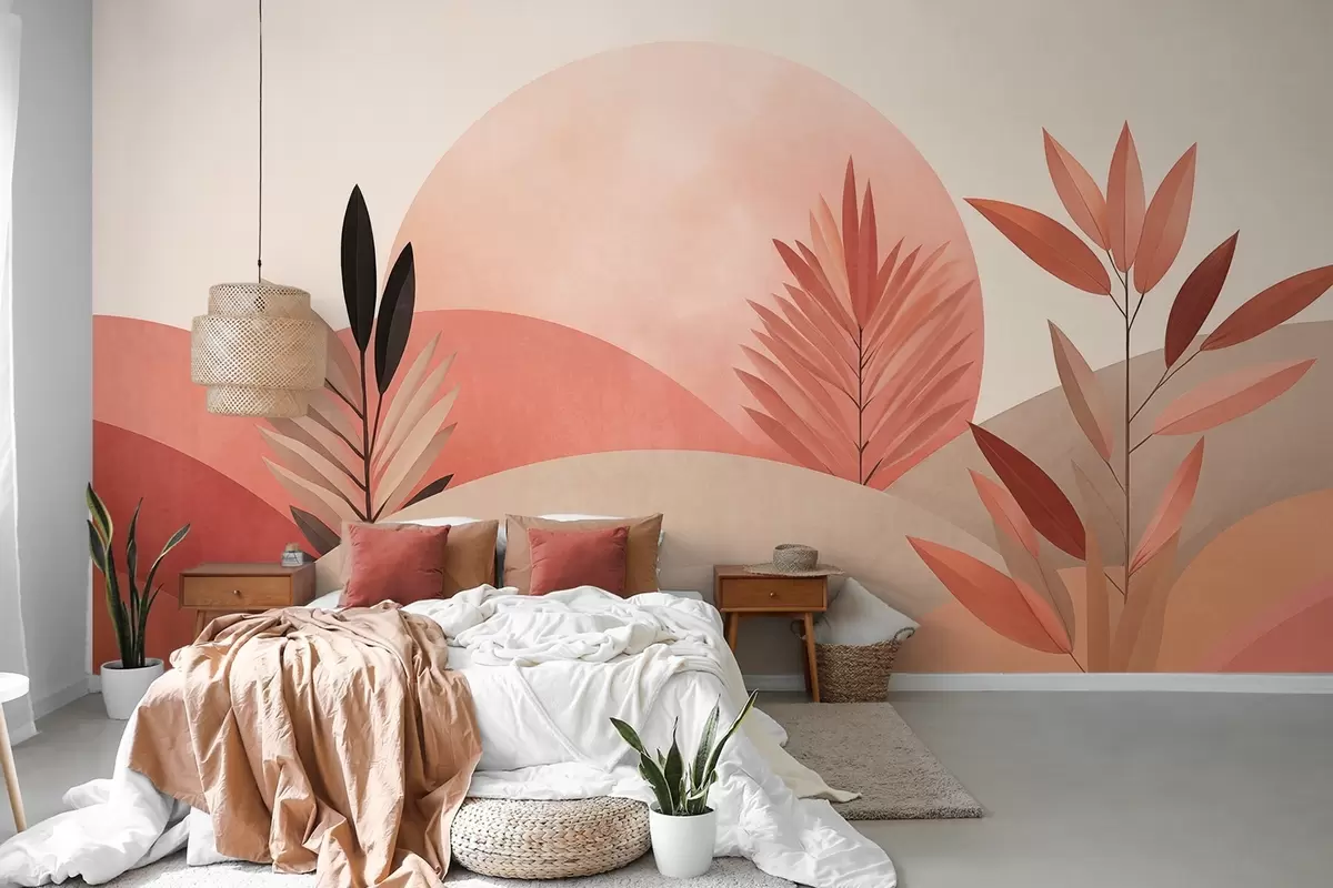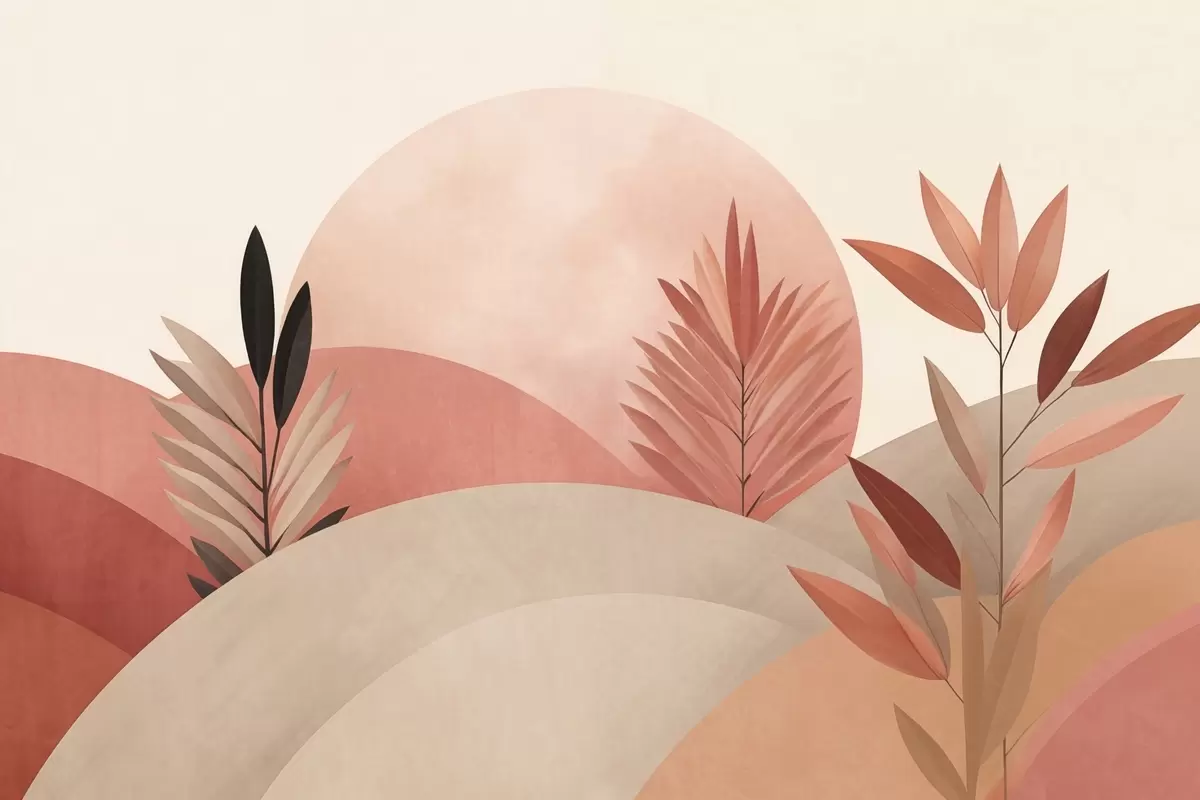 Fotomurales Paisaje boho abstracto, sol detrás de colinas onduladas, plantas en primer plano, minimalista, texturizado, colores apagados. Nr. w09608