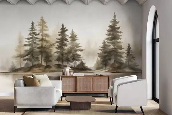 Fotomurales Un bosque brumoso con textura y altos pinos pintados de imitación. Nr. w09610