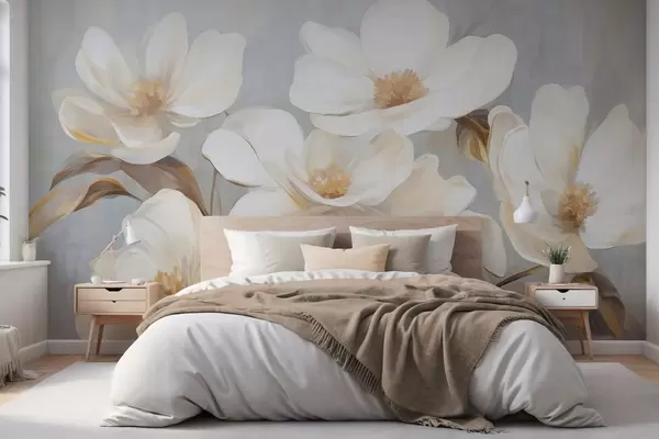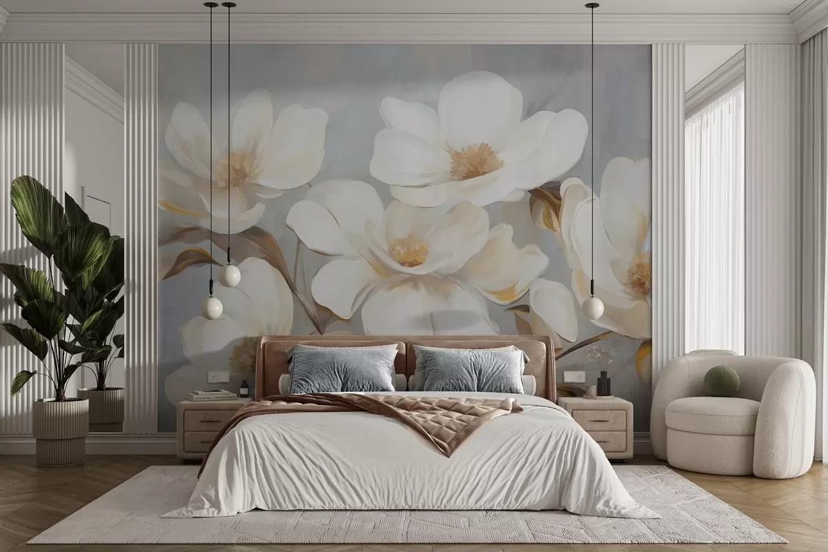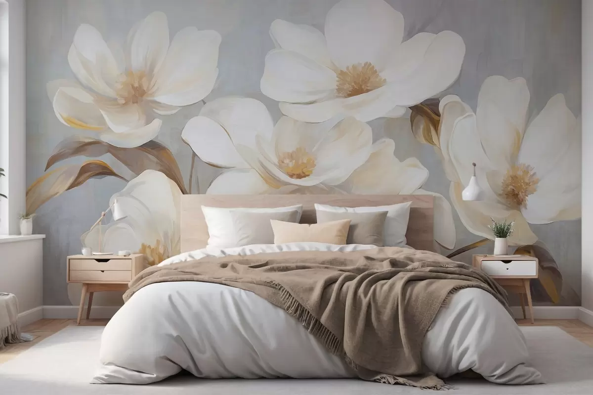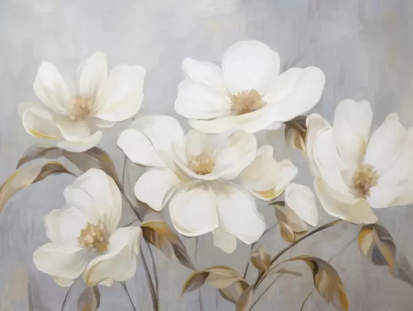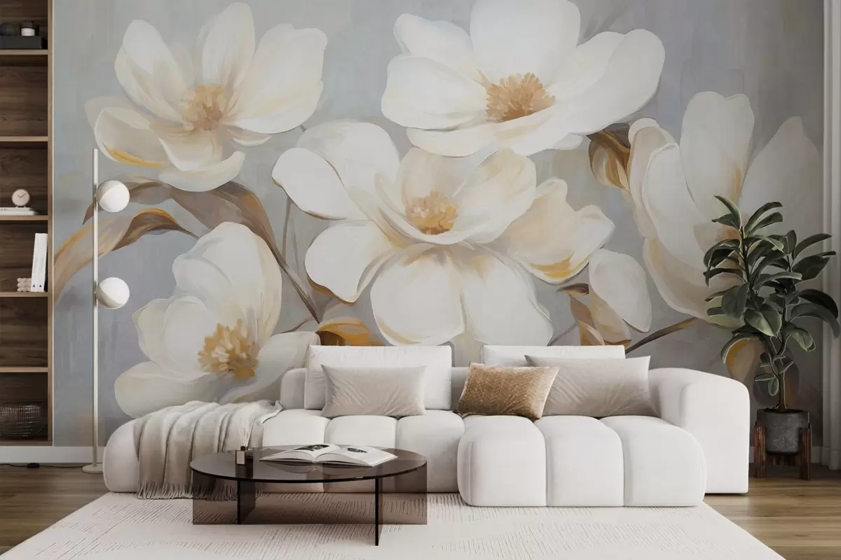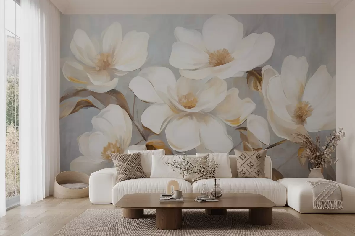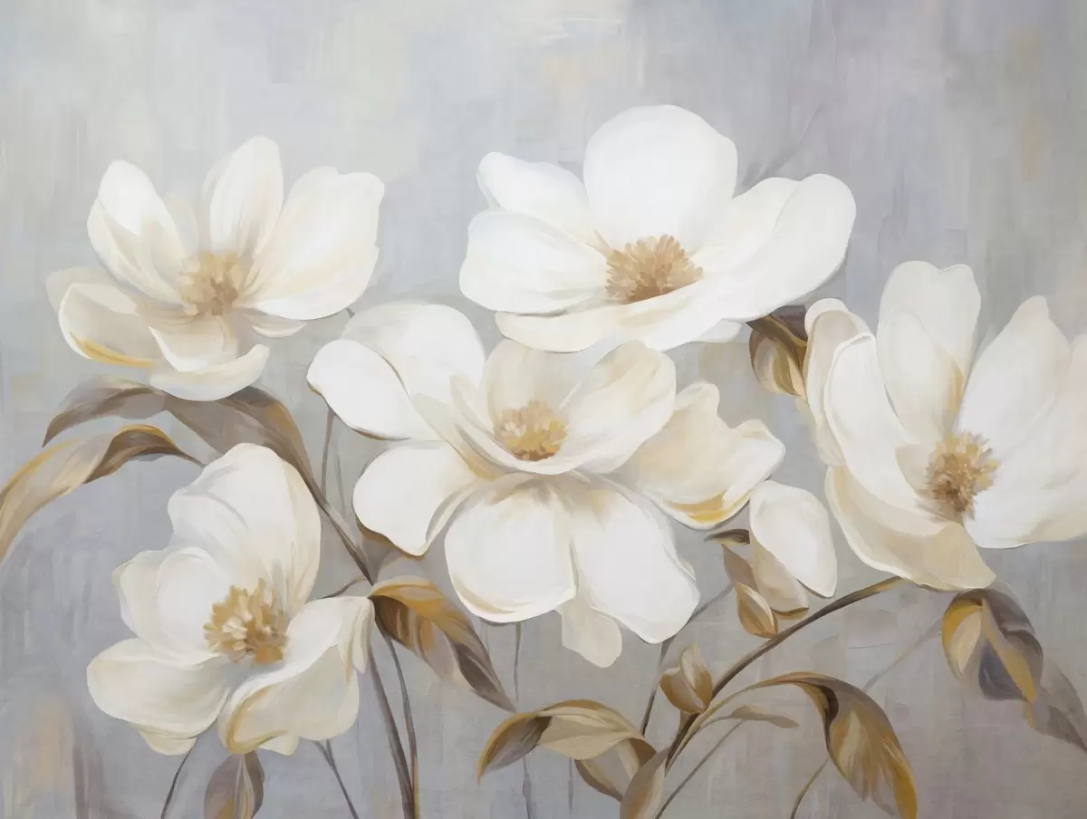 Fotomurales Una pintura texturizada que imita varias flores blancas de magnolia sobre un fondo pastel apagado. Nr. w09612