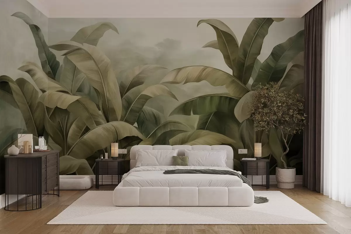 Fotomurales Paisaje selvático denso y texturizado con grandes hojas de plátano en tonos verdes y beige apagados. Nr. w09613