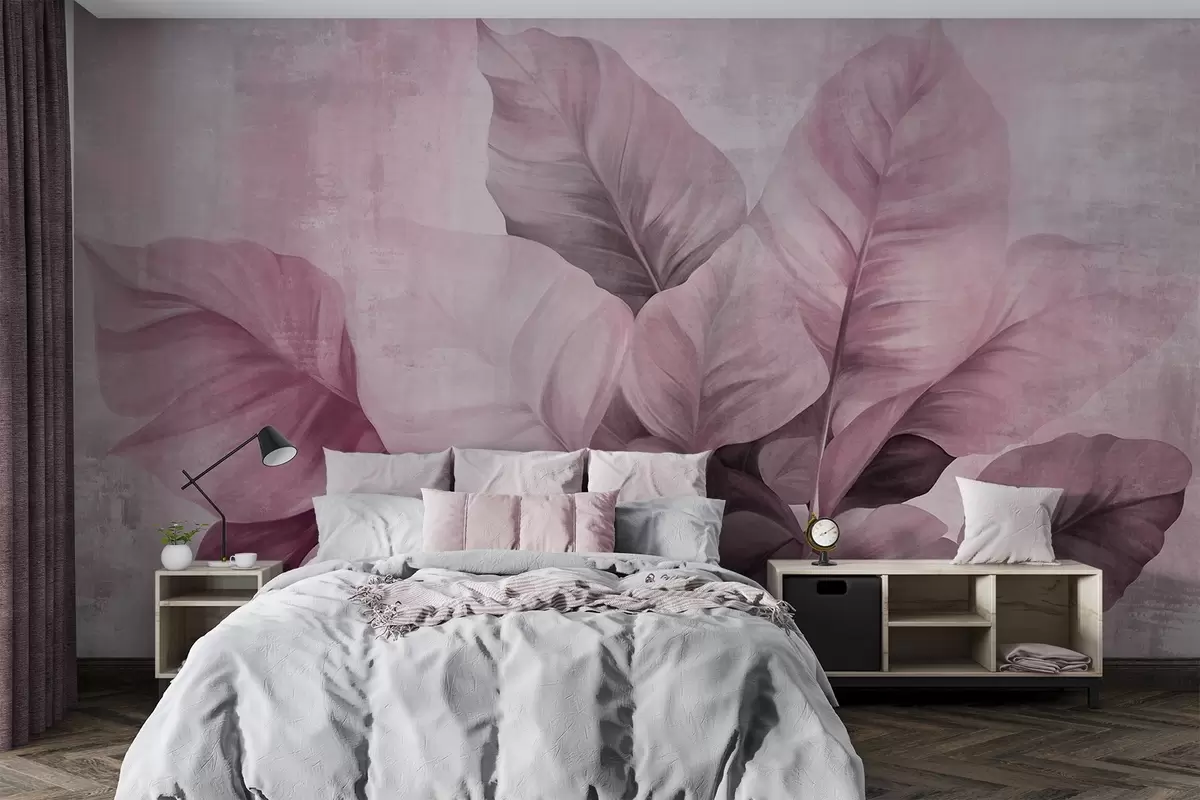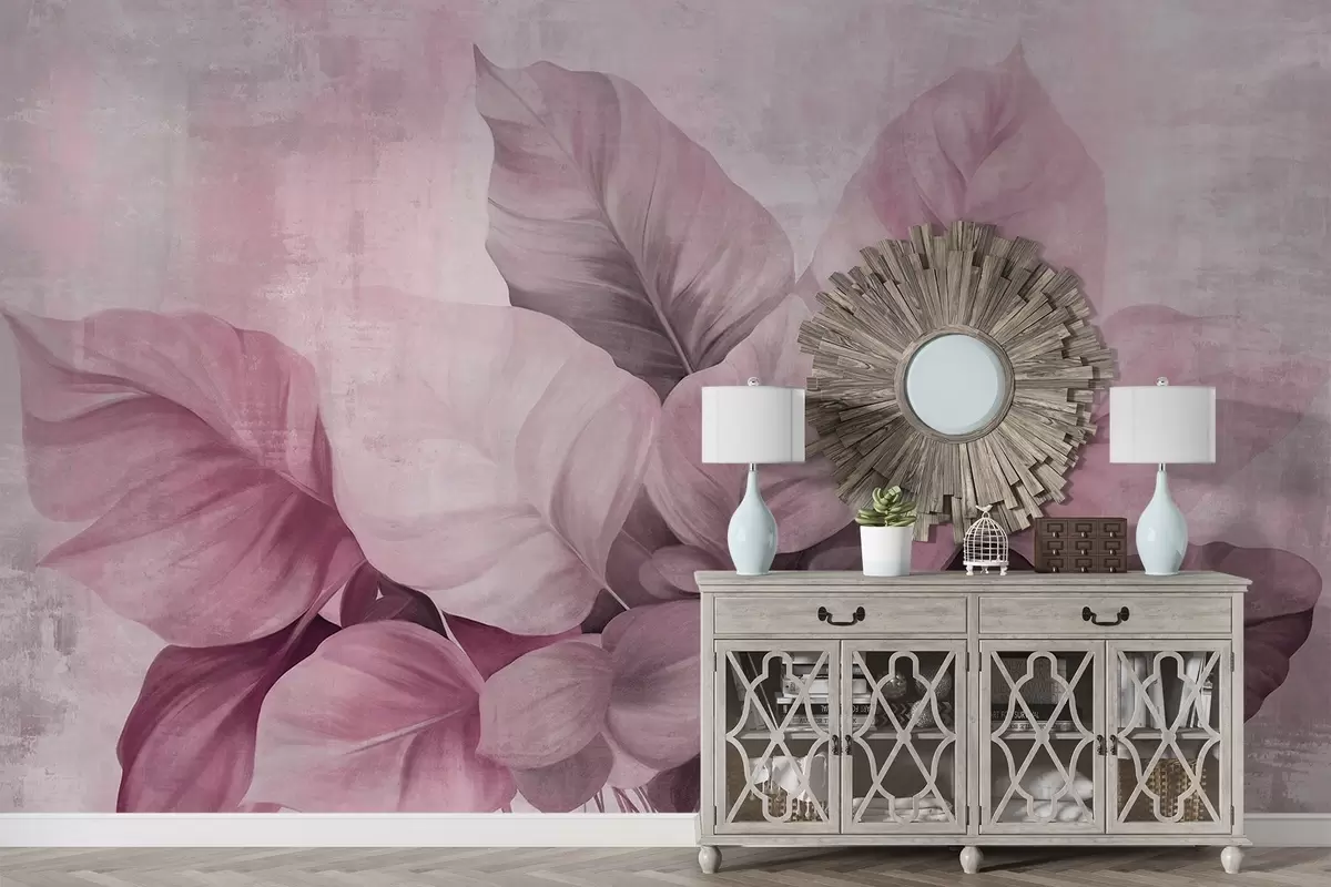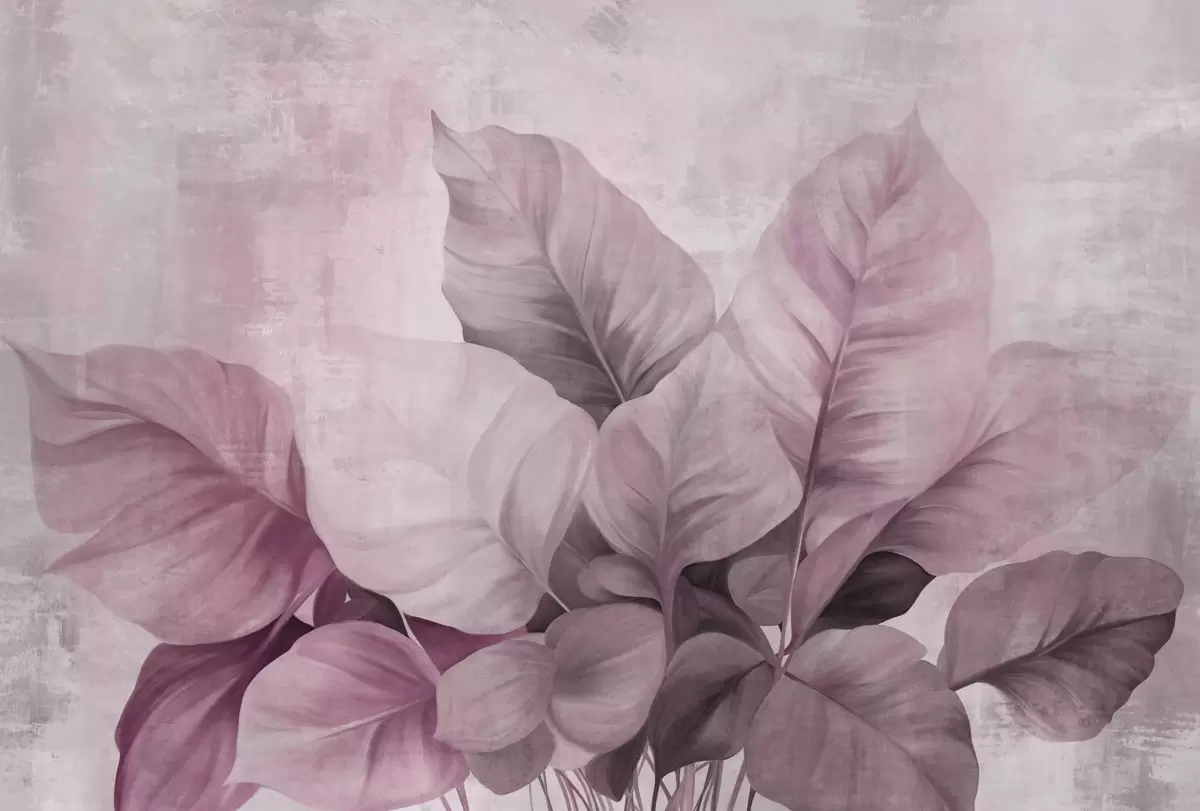 Fotomurales Imitacione de pintura texturizada de hojas grandes de color rosa claro sobre un fondo neutro con pinceladas sutiles. Nr. w09614v1