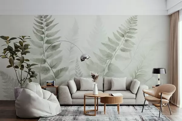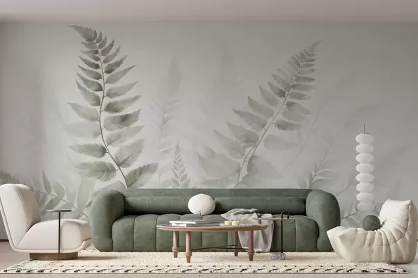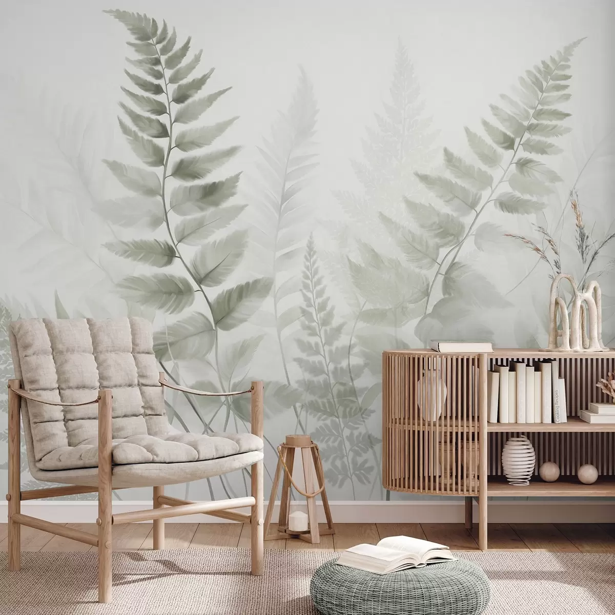 Fotomurales Hojas secas de helecho con textura en varios tonos de verde, con un fondo suave y claro en estilo acuarela. Nr. w09615v1