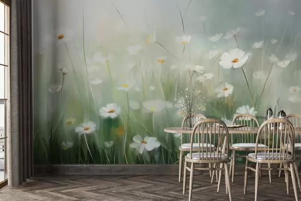 Fotomurales Campo abstracto de margaritas blancas con hierba verde y un fondo suave y difuso en estilo pictórico. Nr. w09619