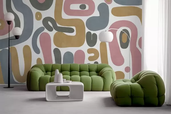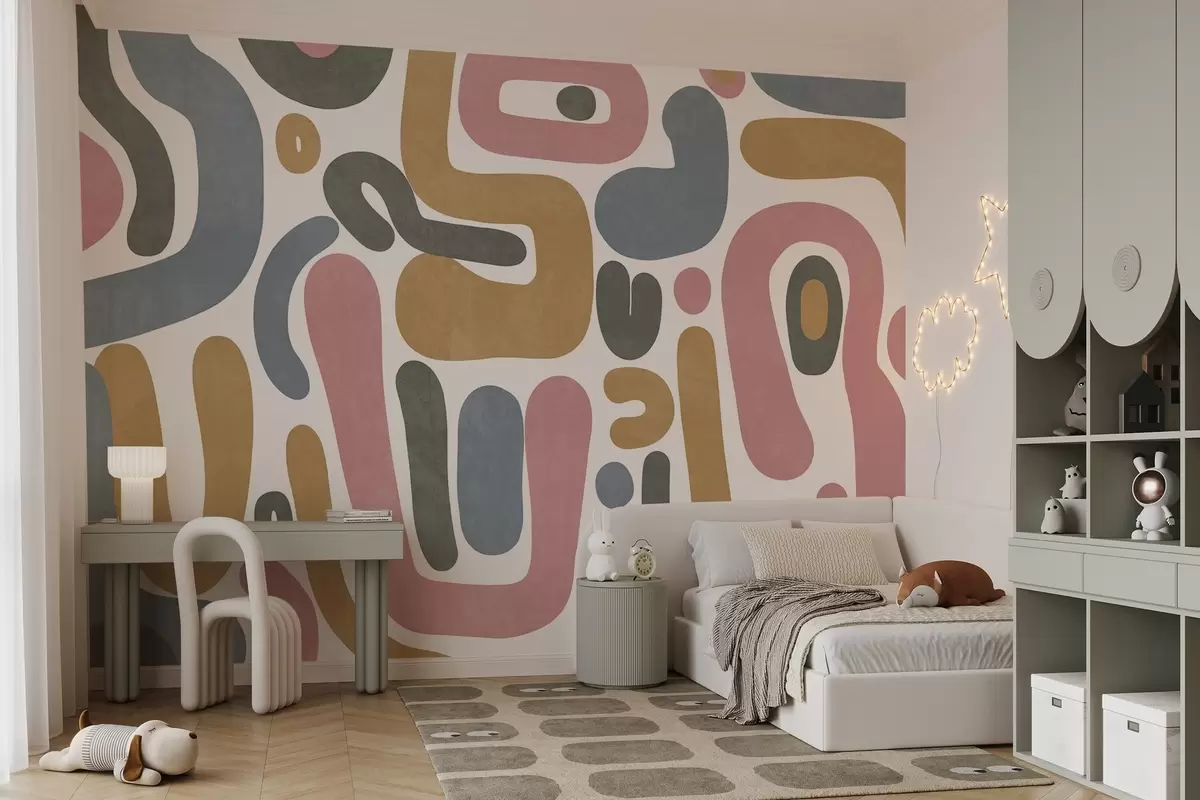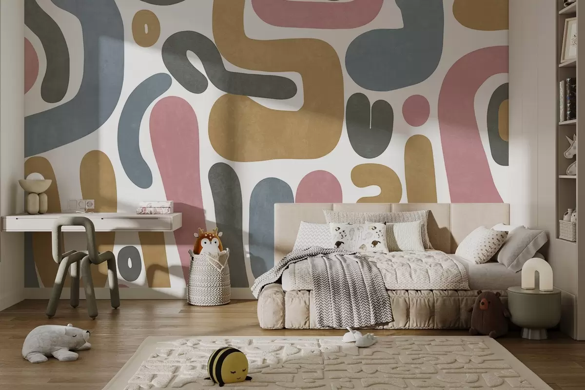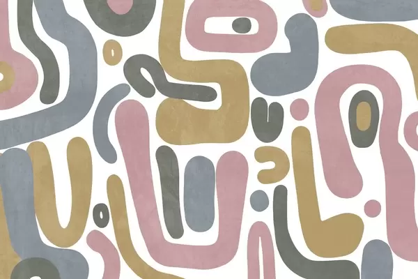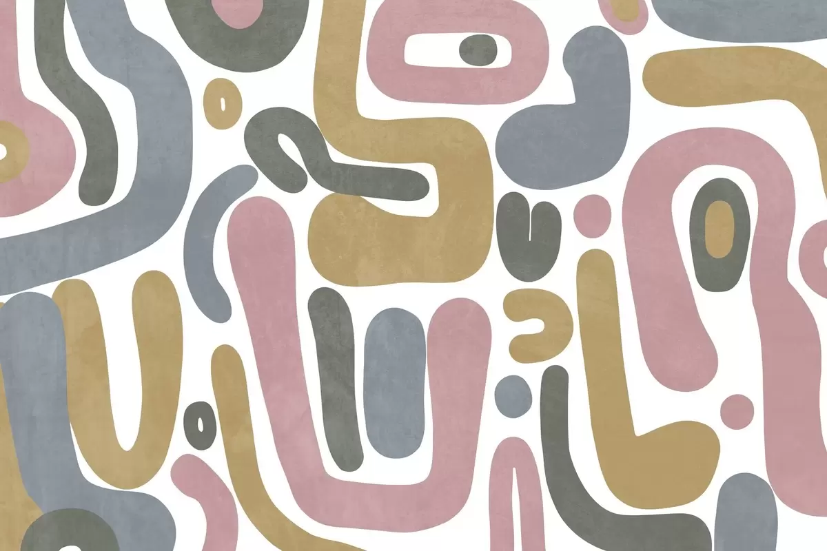 Fotomurales Formas abstractas con textura en rosa pastel, azul apagado, amarillo mostaza y gris sobre fondo blanco, arte moderno. Nr. w09620