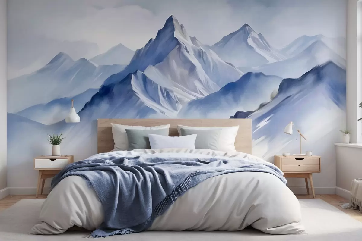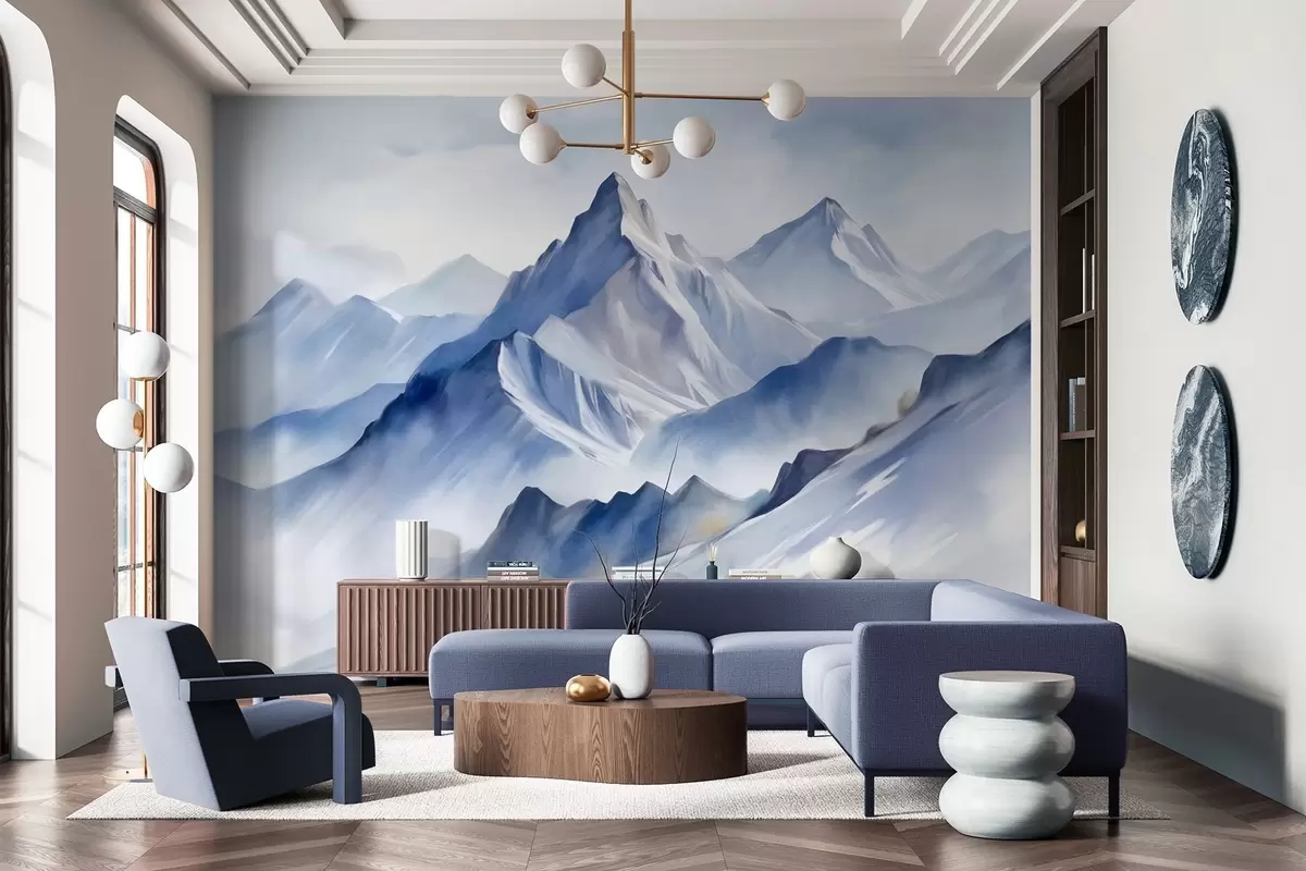 Fotomurales Montañas nevadas con textura, un suave efecto acuarela y una paleta de colores azul y blanco. Nr. w09630