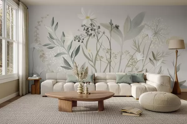 Fotomurales Delicadas flores silvestres y follaje con textura en tonos verdes y crema apagados sobre un fondo beige suave. Nr. w09641