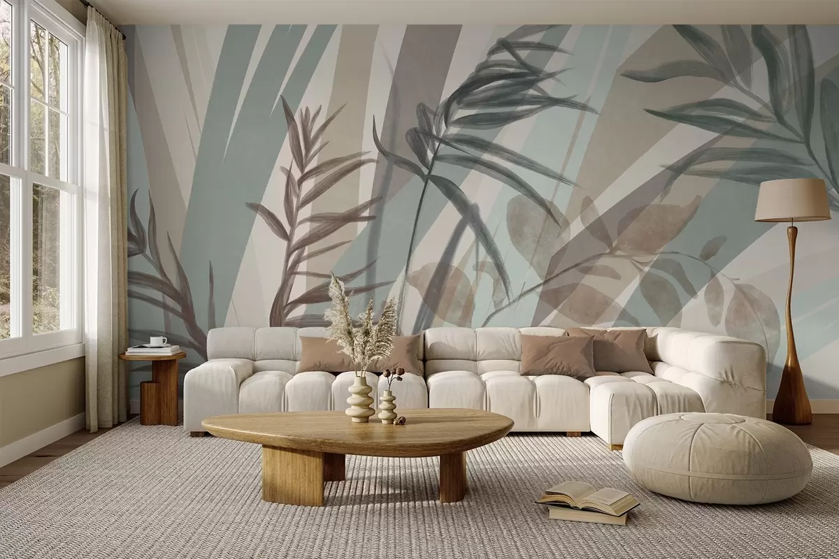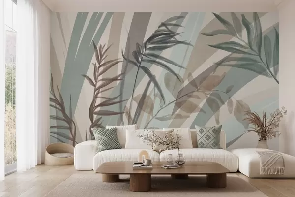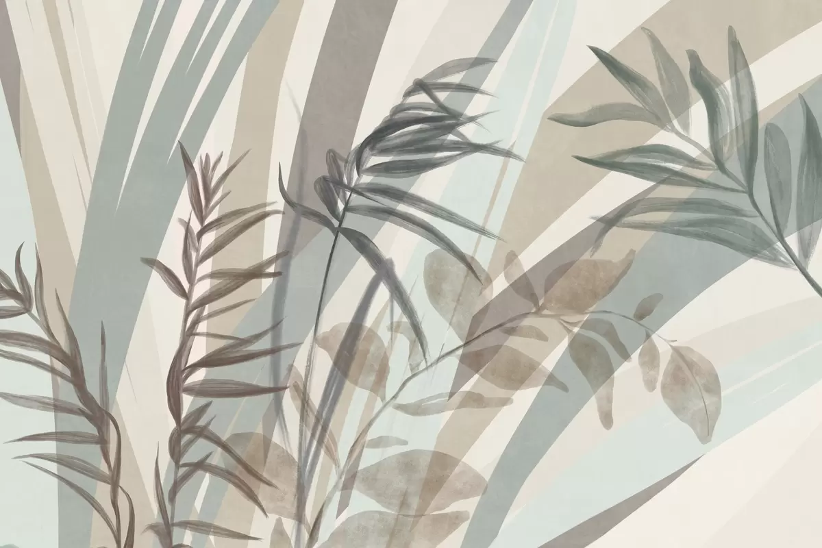 Fotomurales Hierba alta con textura y hojas en tonos tierra apagados, con líneas abstractas en el fondo, creando un estampado orgánico. Nr. w09643
